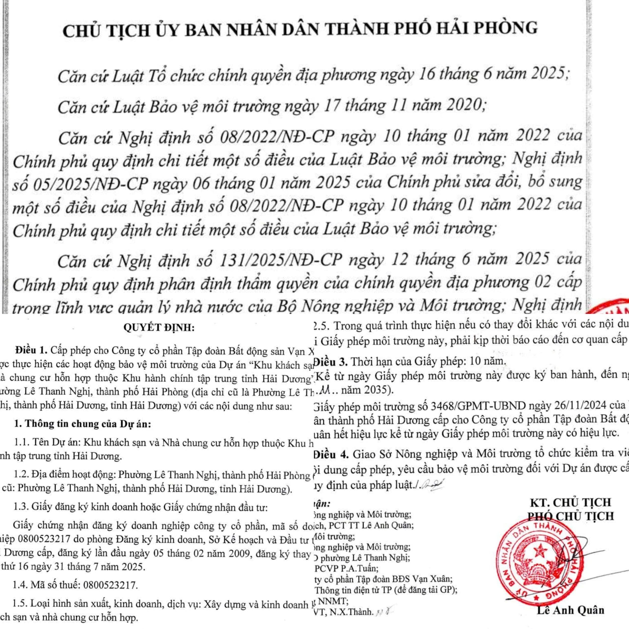 Giấy phép môi trường số 4592/GPMT-UBND do ông Lê Anh Quân, Phó Chủ tịch UBND TP Hải Phòng ký ngày 14/11/2025 cấp phép cho Công ty cổ phần Tập đoàn Bất động sản Vạn Xuân được thực hiện các hoạt động bảo vệ môi trường của Dự án “Khu khách sạn và Nhà chung cư hỗn hợp thuộc Khu hành chính tập trung tỉnh Hải Dương” tại phường Lê Thanh Nghị, TP Hải Phòng (địa chỉ cũ là phường Lê Thanh Nghị, TP Hải Dương, tỉnh Hải Dương).