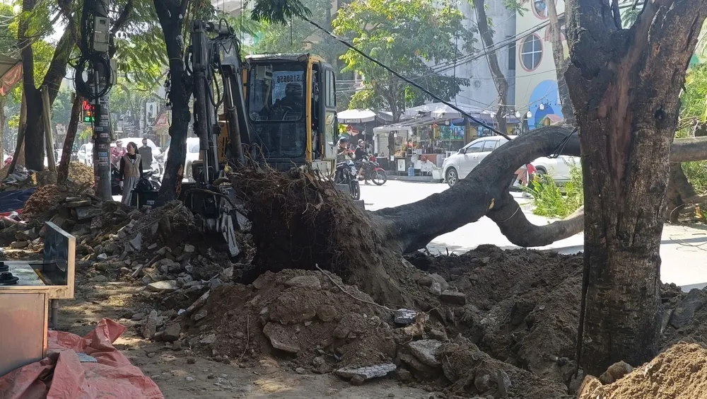 Một số người dân sinh sống trong khu vực này cho biết trong sáng nay, đoạn vỉa hè cạnh các gốc cây được đào sâu khoảng 1 m, làm đứt gẫy nhiều rễ cây.