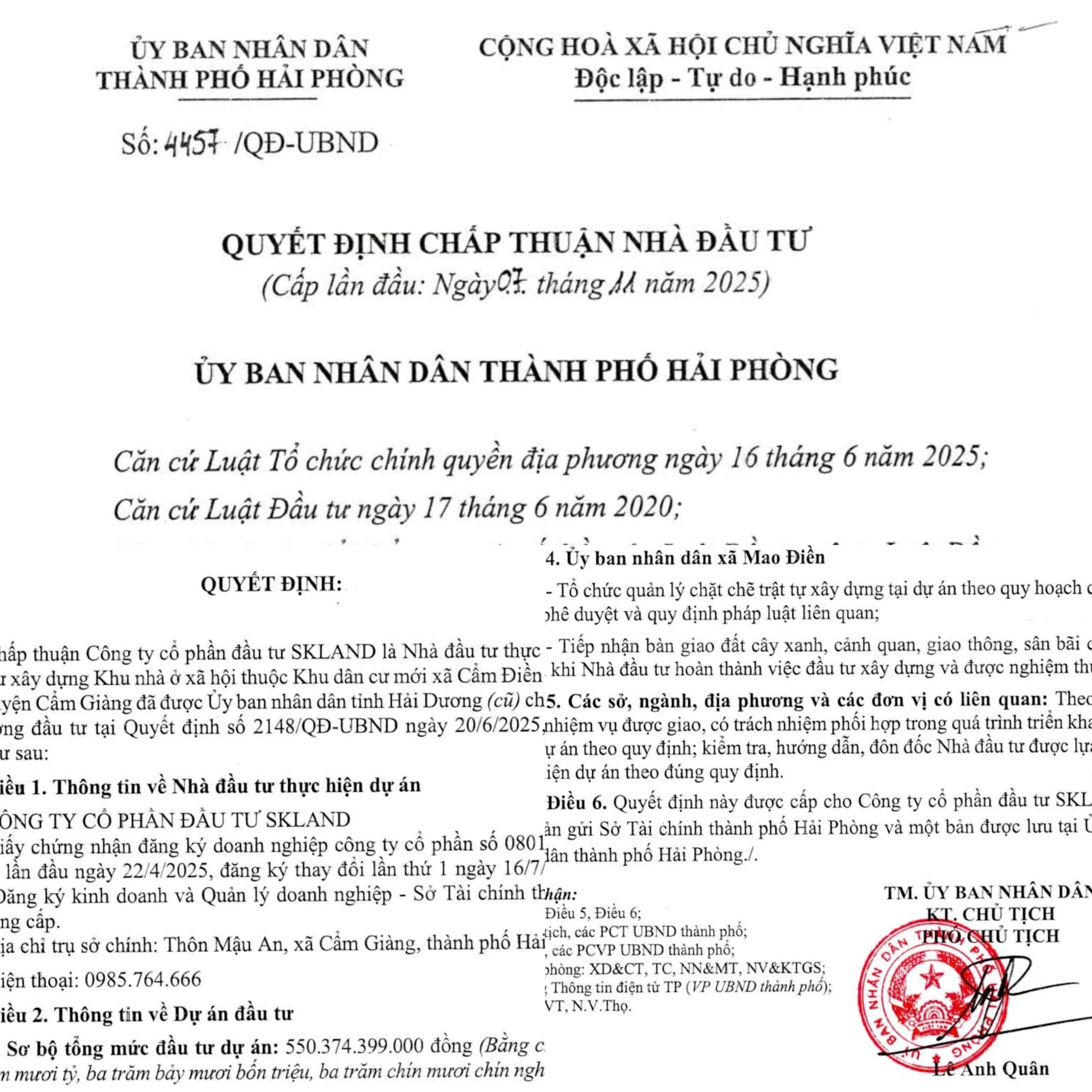 Quyết định số 4457/QĐ-UBND do ông Lê Anh Quân, Phó Chủ tịch UBND TP Hải Phòng ký ngày 07/11/2025 về việc chấp thuận Công ty cổ phần đầu tư SKLAND là Nhà đầu tư thực hiện Dự án đầu tư xây dựng Khu nhà ở xã hội thuộc Khu dân cư mới xã Cẩm Điền - Lương Điền, huyện Cẩm Giàng đã được UBND tỉnh Hải Dương (cũ) chấp thuận chủ trương đầu tư tại Quyết định số 2148/QĐ-UBND ngày 20/6/2025.
