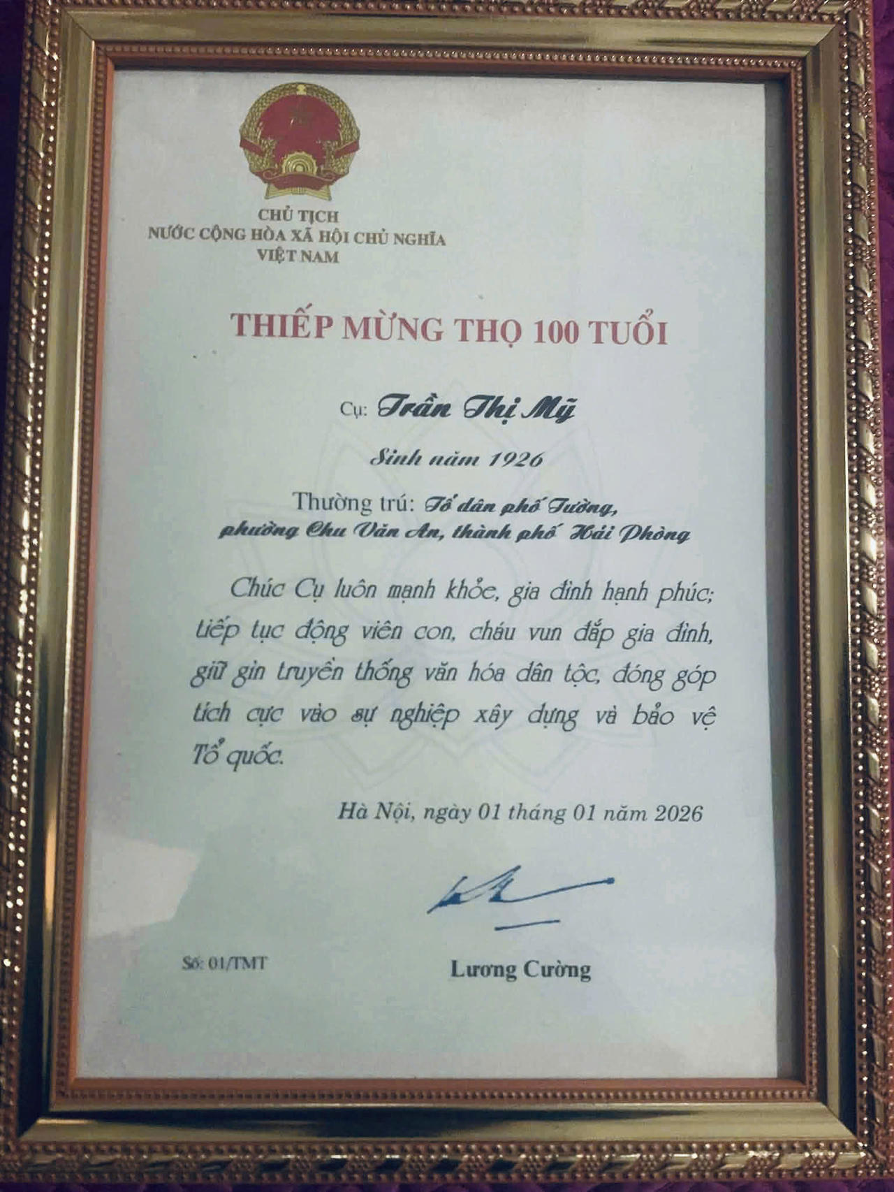 Cụ bà Trần Thị Mỹ (100 tuổi) cùng con cháu nhận Thiếp mừng thọ 100 tuổi của Chủ tịch nước Cộng hòa xã hội chủ nghĩa Việt Nam