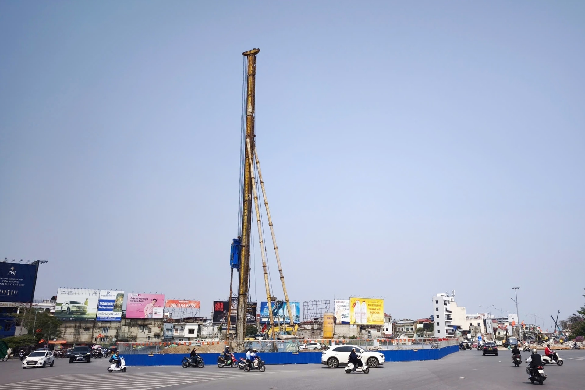Khu vực thi công tại ngã 6 được quây tôn để triển khai xử lý nền đất yếu.