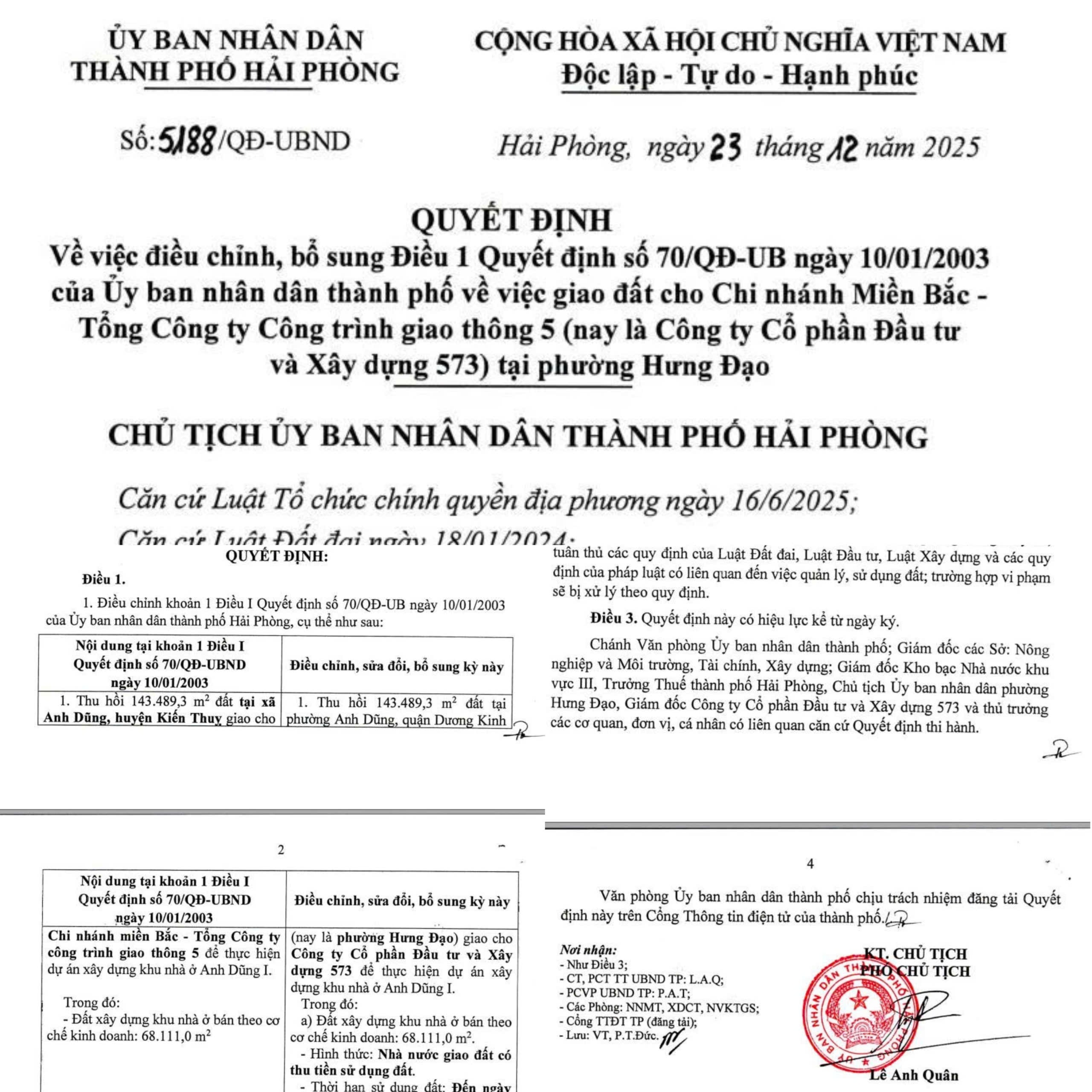 Quyết định số 5188/QĐ-UBND do ông Lê Anh Quân, Phó Chủ tịch UBND TP Hải Phòng ký ngày 23/12/2025 về việc điều chỉnh, bổ sung Điều 1 Quyết định số 70/QĐ-UB ngày 10/01/2003 của UBND TP về việc giao đất cho Chi nhánh Miền Bắc -Tổng Công ty Công trình giao thông 5 (nay là Công ty Cổ phần Đầu tư và Xây dựng 573) tại phường Hưng Đạo.