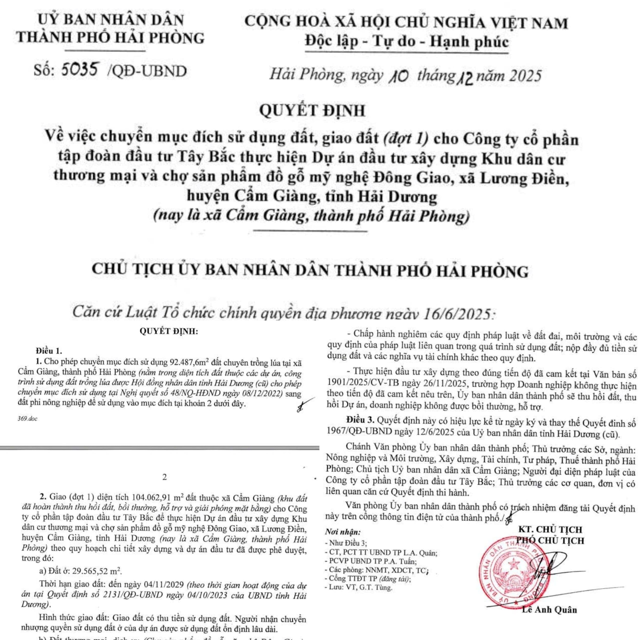 Quyết định số 5035/QĐ-UBND do ông Lê Anh Quân, Phó Chủ tịch UBND TP Hải Phòng ký ngày 10/12/2025 về việc chuyển mục đích sử dụng đất, giao đất (đợt 1) cho Công ty cổ phần tập đoàn đầu tư Tây Bắc thực hiện Dự án đầu tư xây dựng Khu dân cư thương mại và chợ sản phẩm đồ gỗ mỹ nghệ Đông Giao, xã Lương Điền, huyện Cẩm Giàng, tỉnh Hải Dương (nay là xã Cẩm Giàng, TP Hải Phòng).