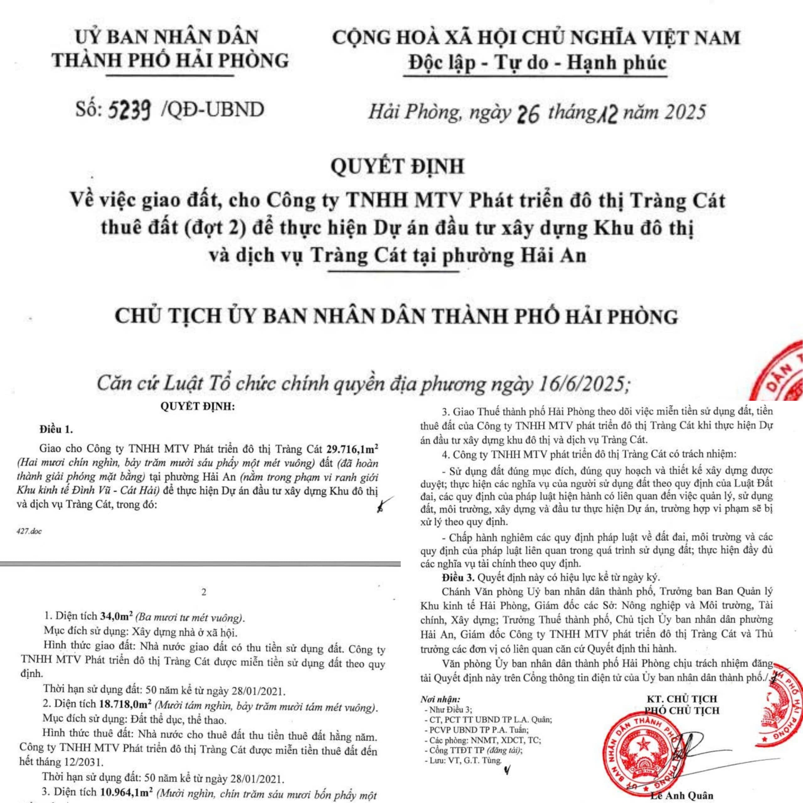 Quyết định số 5239/QĐ-UBND do ông Lê Anh Quân, Phó Chủ tịch UBND TP Hải Phòng ký ngày 26/12/2025 về việc giao đất, cho Công ty TNHH MTV Phát triển đô thị Tràng Cát thuê đất (đợt 2) để thực hiện Dự án đầu tư xây dựng Khu đô thị và dịch vụ Tràng Cát tại phường Hải An.
