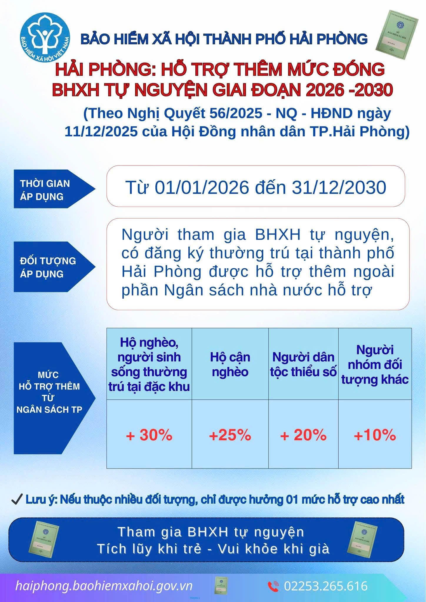 Theo Nghị quyết số 56/2025/NQ-HĐND ngày 11/12/2025 của HĐND TP Hải Phòng, mức hỗ trợ người dân tham gia các chính sách bảo hiểm tiếp tục được nâng lên.