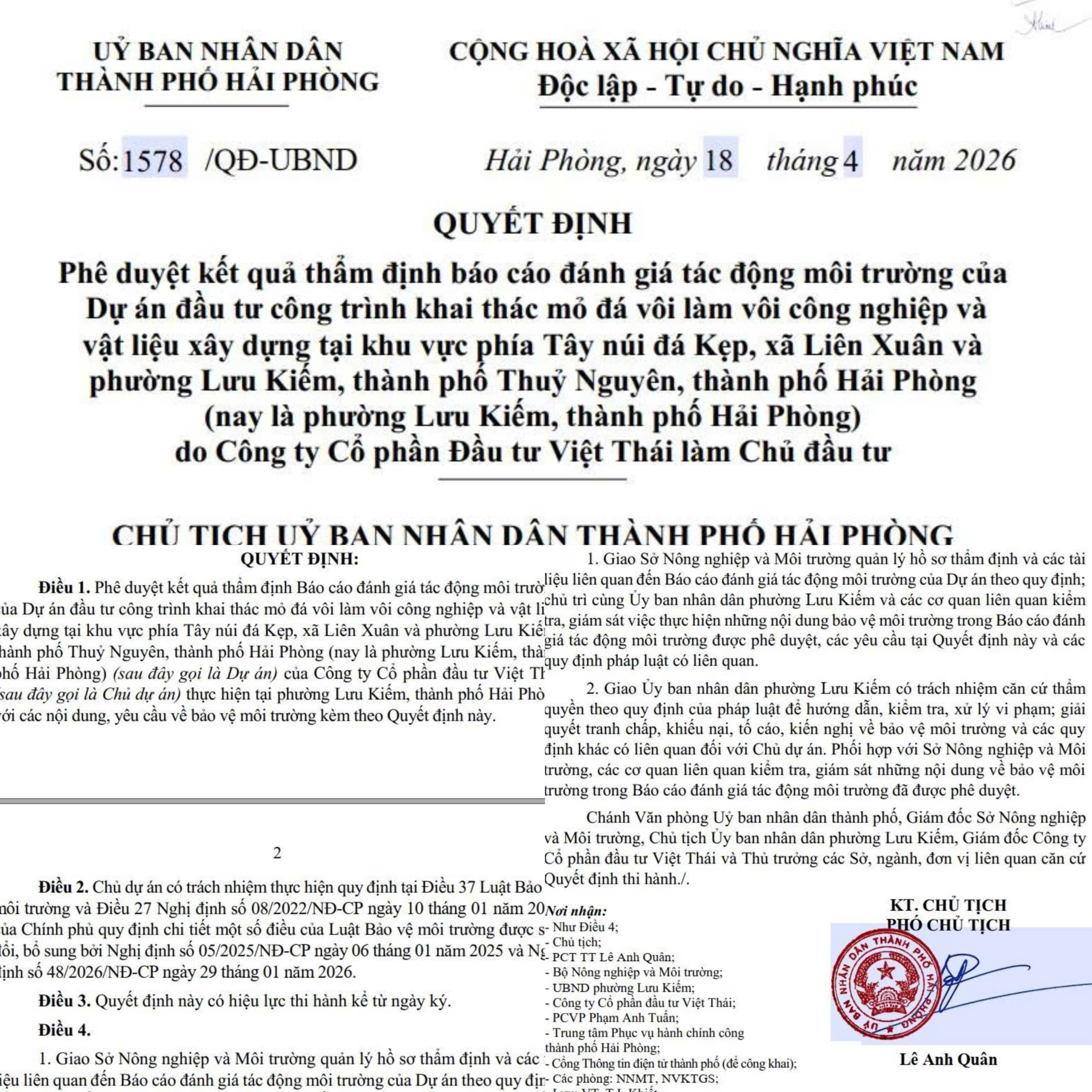 Quyết định số 1578/QĐ-UBND do ông Lê Anh Quân, Phó Chủ tịch UBND TP Hải Phòng ký ngày 18/4/2026 về việc phê duyệt kết quả thẩm định báo cáo đánh giá tác động môi trường của Dự án đầu tư công trình khai thác mỏ đá vôi làm vôi công nghiệp và vật liệu xây dựng tại khu vực phía Tây núi đá Kẹp, xã Liên Xuân và phường Lưu Kiếm, TP Thủy Nguyên (nay là phường Lưu Kiếm, TP Hải Phòng) do Công ty Cổ phần Đầu tư Việt Thái làm Chủ đầu tư.