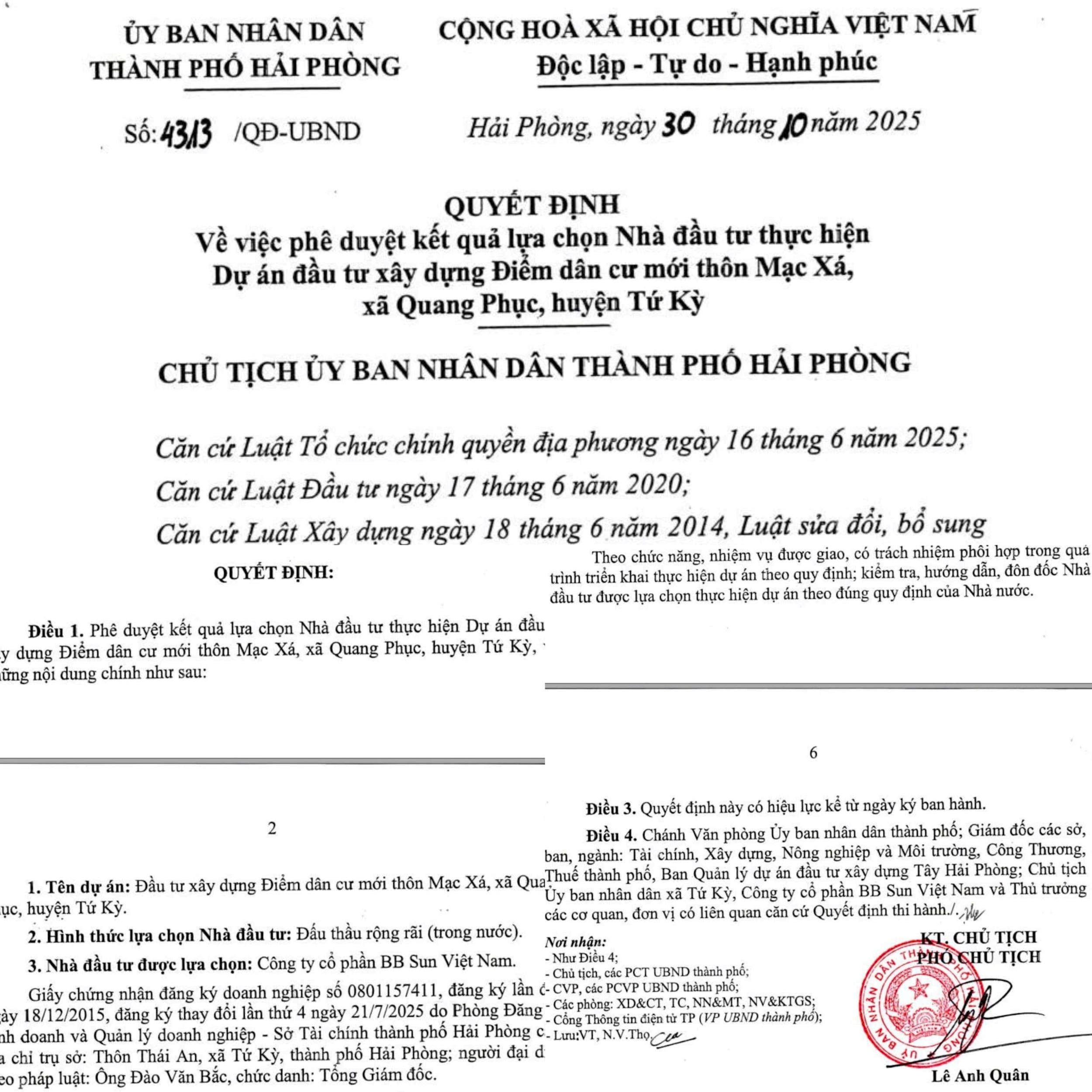 Quyết định số 4313/QĐ-UBND do ông Lê Anh Quân, Phó Chủ tịch UBND TP Hải Phòng ký ngày 30/10/2025 về việc phê duyệt kết quả lựa chọn Nhà đầu tư thực hiện Dự án đầu tư xây dựng Điểm dân cư mới thôn Mạc Xá, xã Tứ Kỳ.