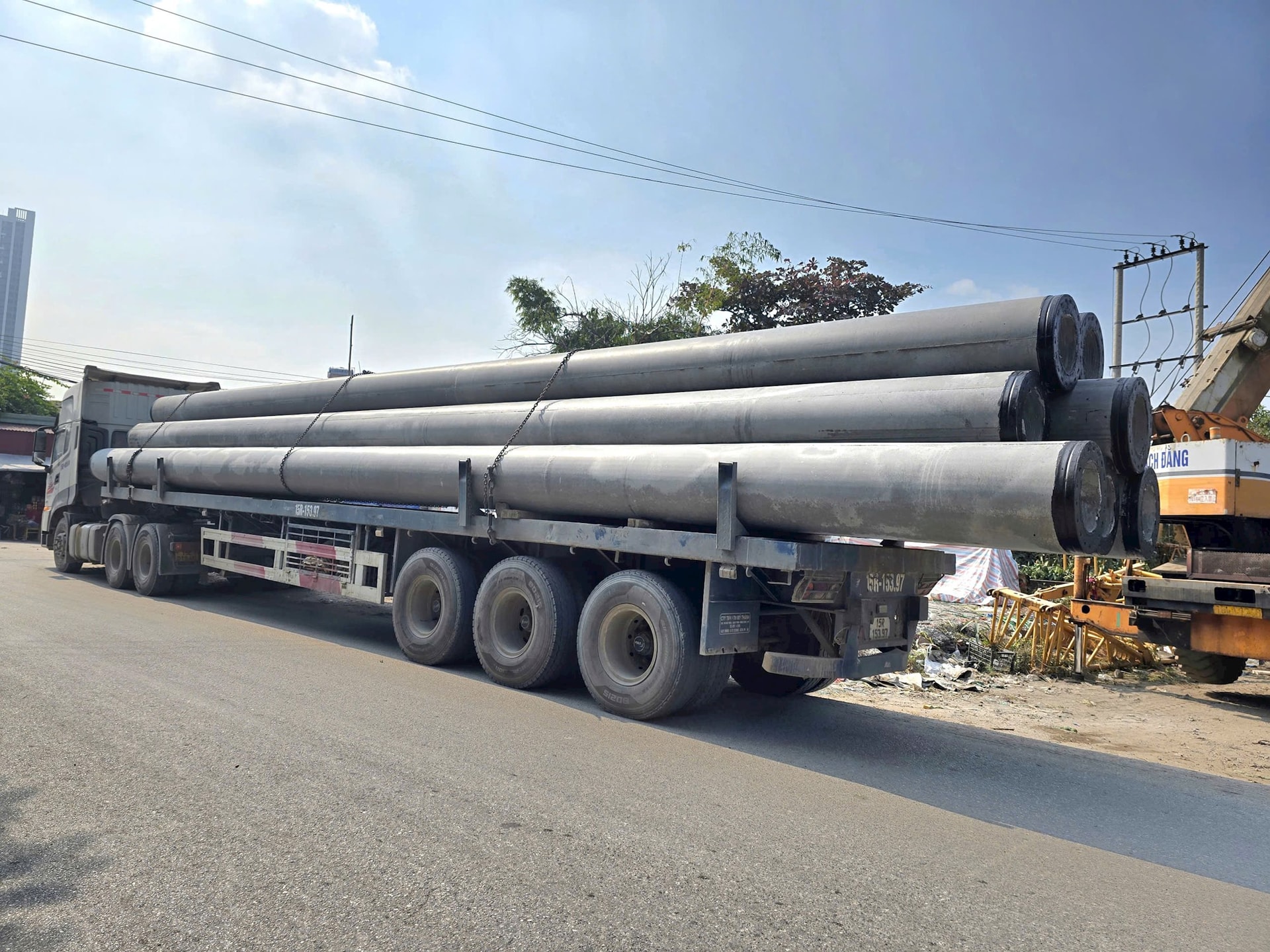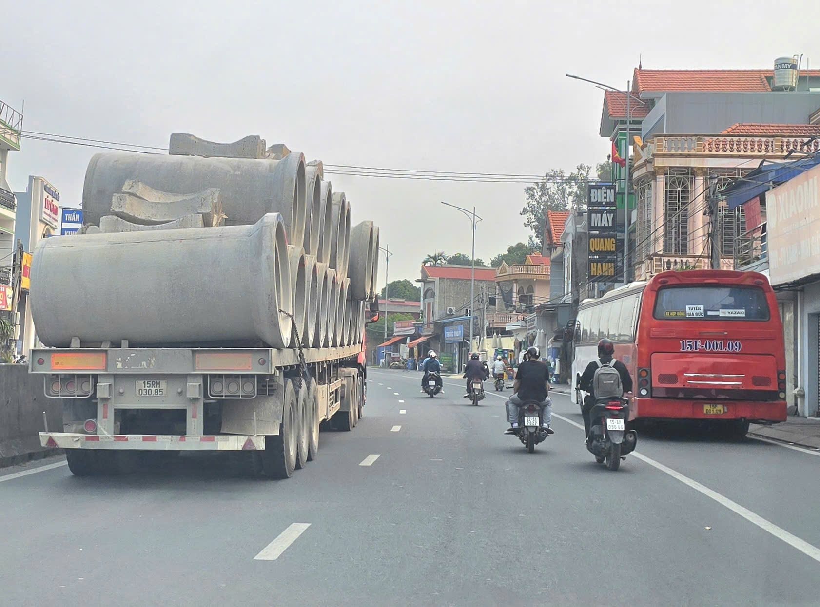 Nhiều xe tải chở cọc bê tông dài quá khổ 2-3m thường xuyên lưu thông trên địa bàn thành phố Hải Phòng. (Ảnh: Trần Khanh).
