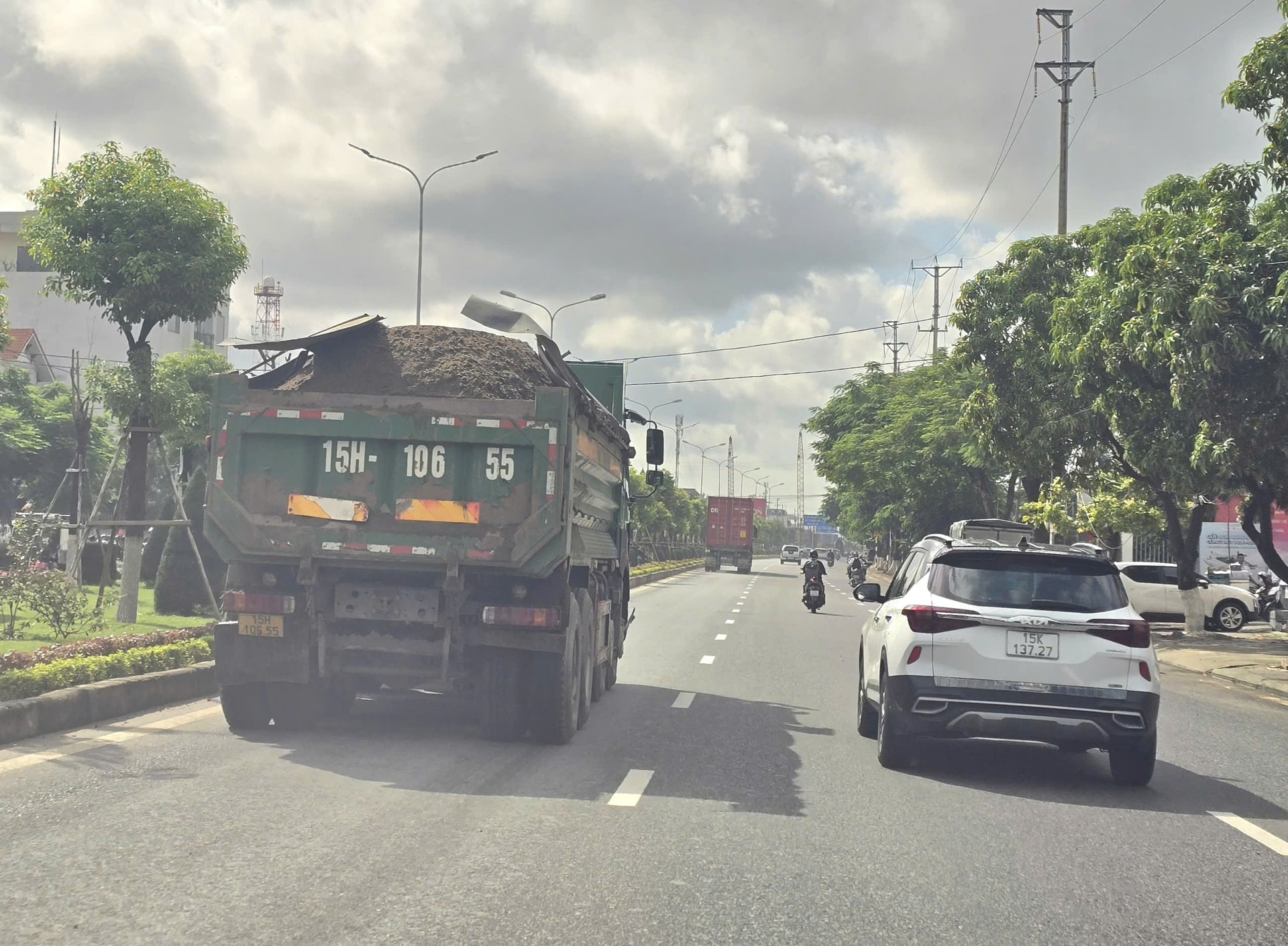 Xe chở vật liệu quá thành thùng gây bụi bặm trên tuyến đường Phạm Văn Đồng, thành phố Hải Phòng. (Ảnh: Trần Khanh).