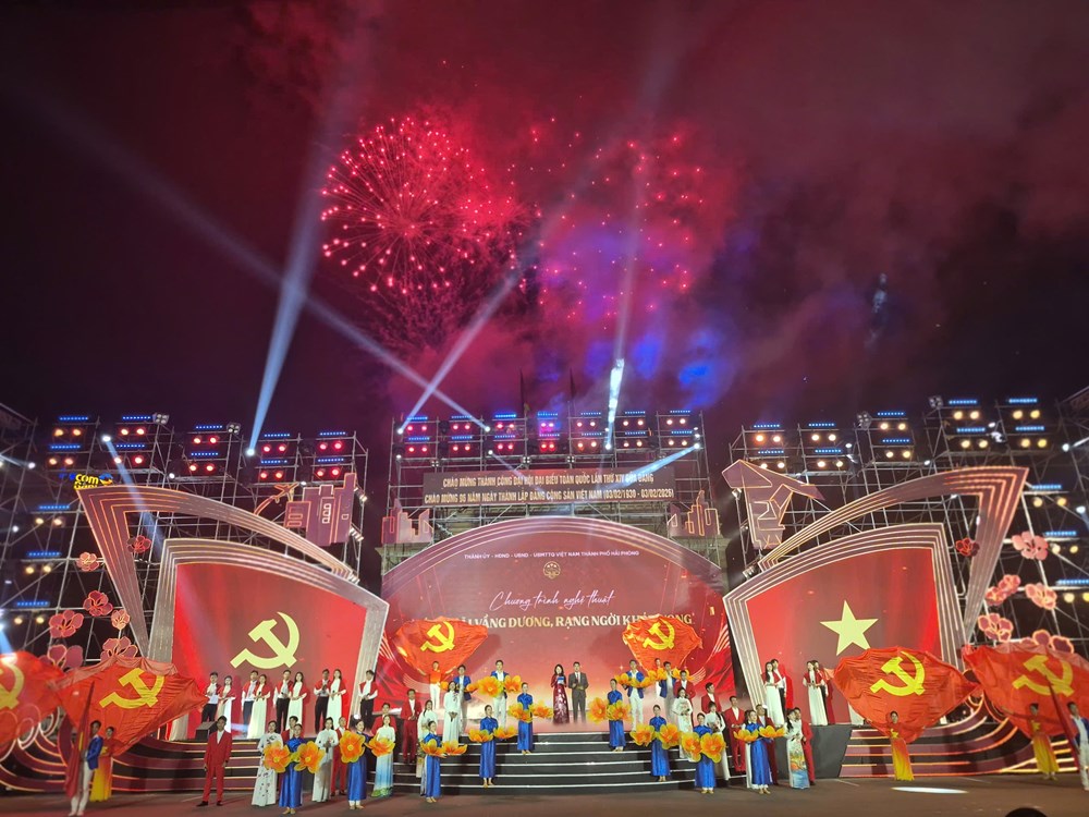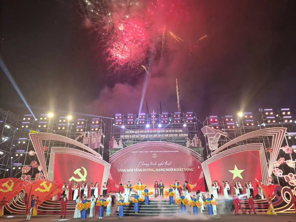Khép lại chương trình là màn bắn pháo hoa tầm cao kéo dài 15 phút tại cả hai điểm cầu. Những chùm pháo hoa rực rỡ bừng sáng bầu trời thành phố Cảng như lời chúc mừng thành công Đại hội XIV của Đảng, đồng thời là biểu tượng cho ý chí, niềm tin và khát vọng vươn lên không ngừng của Đảng bộ, chính quyền và nhân dân Hải Phòng.