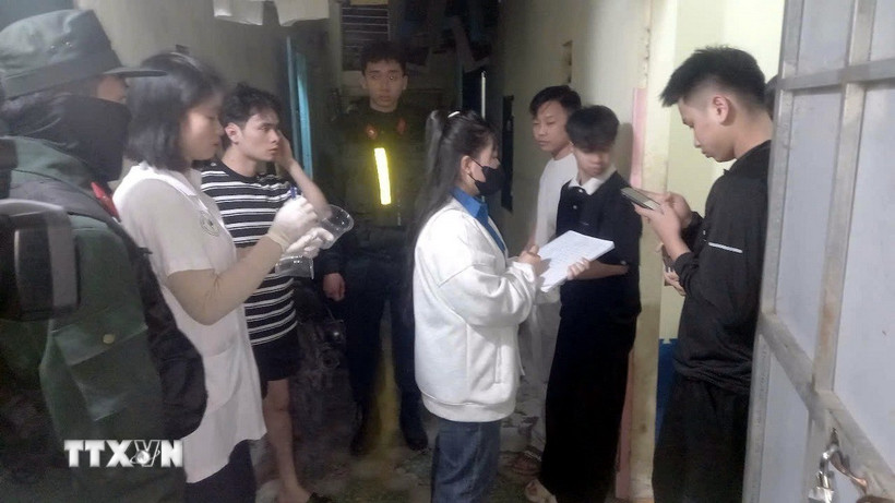 Lực lượng chức năng kiểm tra, xét nghiệm ma túy đối với người lao động tại các khu nhà trọ tại xã Mao Điền. (Ảnh: TTXVN phát)