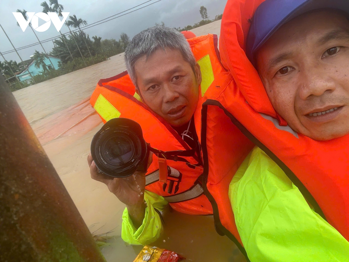 Các phóng viên bám vào trụ điện để không bị cuốn trôi