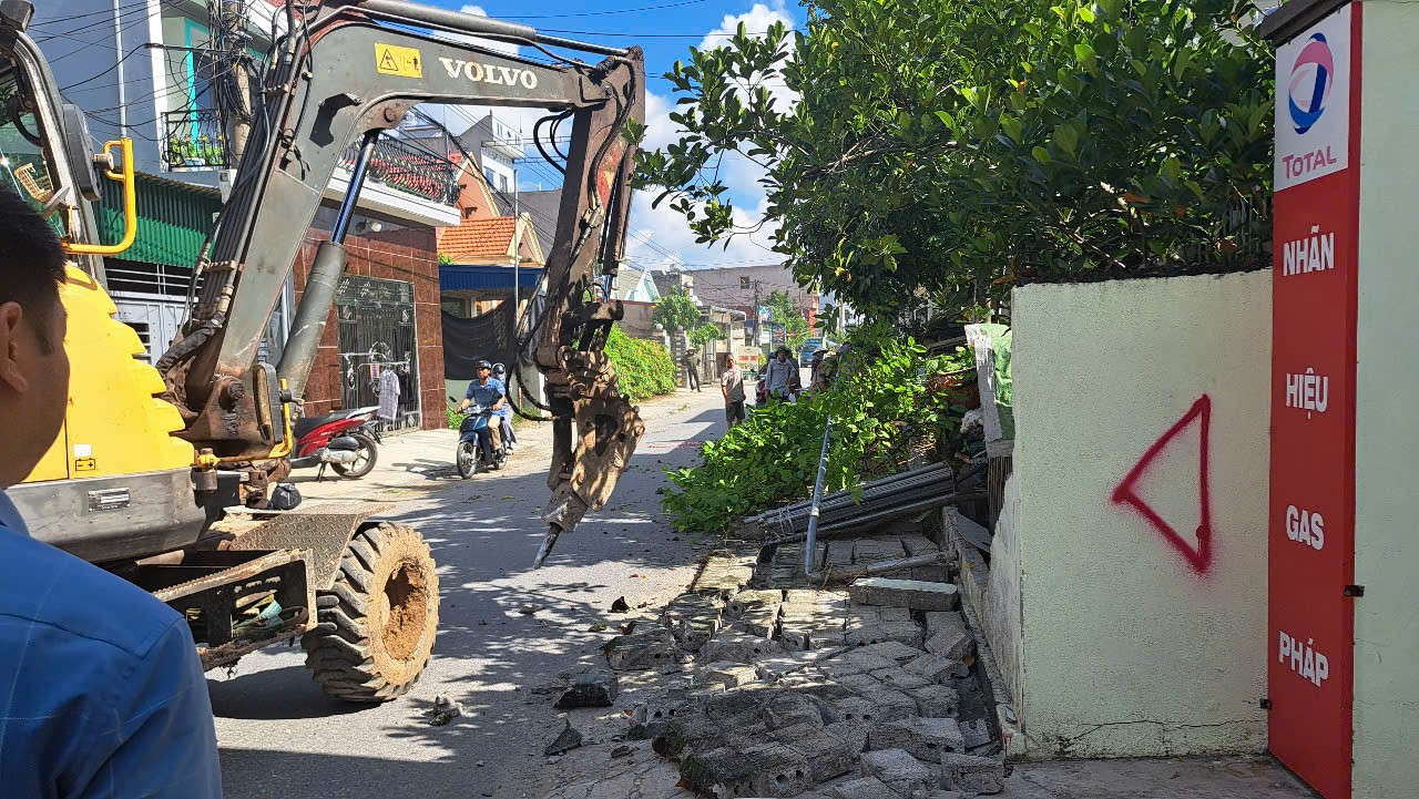 Lực lượng chức năng tháo dỡ tường bao hộ dân sau khi được vận động, tạo mặt bằng thông thoáng cho dự án.
