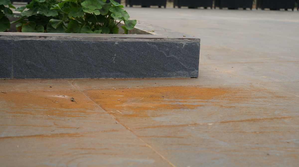 Bụi màu vàng xuất hiện tại khuôn viên sân của gia đình ông Lê Tiến Quang (TDP Hạ, phường Hồng An, TP Hải Phòng). Ảnh: PT.