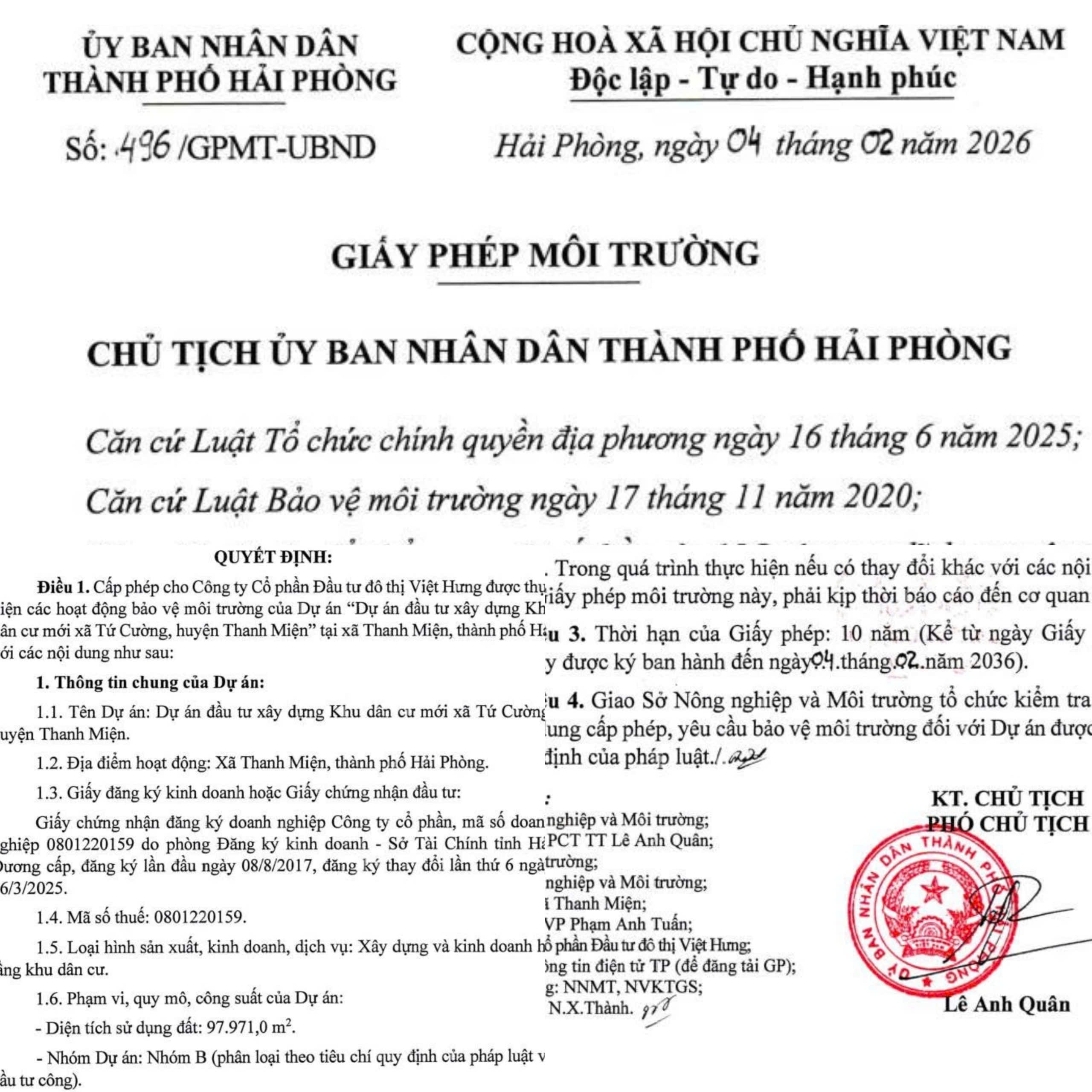 Giấy phép môi trường số 496/GPMT-UBND do ông Lê Anh Quân, Phó Chủ tịch UBND TP Hải Phòng ký ngày 04/2/2026 cấp phép cho Công ty Cổ phần Đầu tư đô thị Việt Hưng được thực hiện các hoạt động bảo vệ môi trường của Dự án “Dự án đầu tư xây dựng Khu dân cư mới xã Tứ Cường, huyện Thanh Miện” tại xã Thanh Miện, TP Hải Phòng.