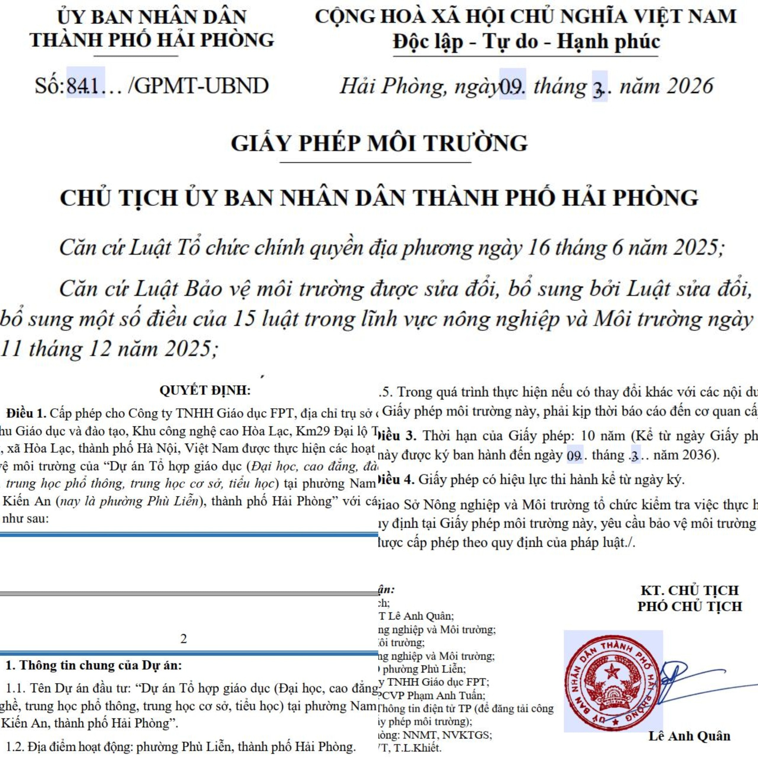 Giấy phép môi trường số 841/GPMT-UBND do ông Lê Anh Quân, Phó Chủ tịch UBND TP Hải Phòng ký ngày 09/2/2026 cấp phép cho Công ty TNHH Giáo dục FPT, địa chỉ trụ sở chính tại Khu Giáo dục và đào tạo, Khu công nghệ cao Hòa Lạc, Km29 Đại lộ Thăng Long, xã Hòa Lạc, TP Hà Nội được thực hiện các hoạt động bảo vệ môi trường của “Dự án Tổ hợp giáo dục (Đại học, cao đẳng, đào tạo nghề, trung học phổ thông, trung học cơ sở, tiểu học) tại phường Nam Sơn, quận Kiến An (nay là phường Phù Liễn), TP Hải Phòng”.