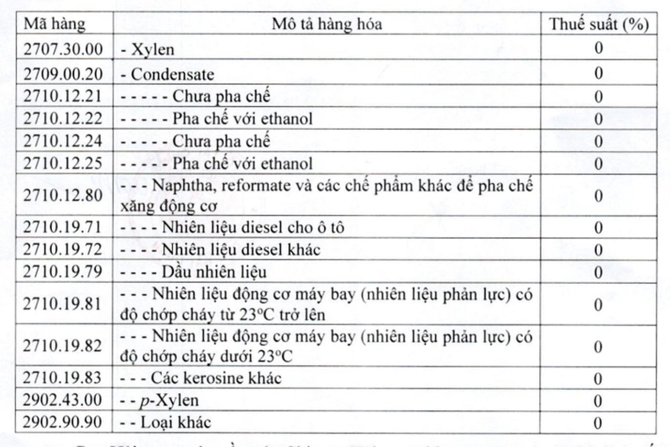 Theo phụ lục ban hành kèm theo Nghị định, thuế suất nhập khẩu ưu đãi đối với một số mặt hàng xăng dầu và nguyên liệu như xylene, condensate, naphtha, reformate, nhiên liệu diesel, dầu nhiên liệu, nhiên liệu động cơ máy bay và một số loại kerosene được điều chỉnh về mức 0%.