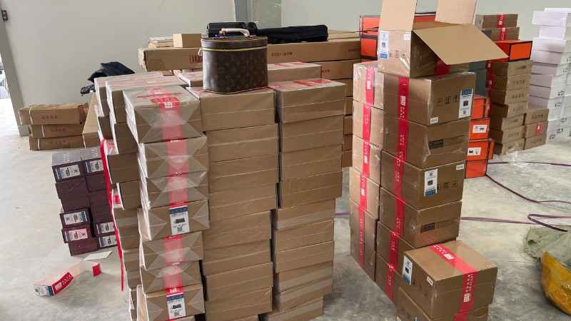 Lực lượng chức năng cũng phát hiện 21 mục hàng không khai báo, trong đó có 5 mục hàng có dấu hiệu vi phạm sở hữu trí tuệ, gồm: 1.100 đôi dép nhựa xốp giả mạo nhãn hiệu Crocs; 50 bộ váy áo giả mạo Balmain; 50 đôi giày thể thao và 900 balo vải giả mạo Nike, trên hàng hóa có chữ “Made in Việt Nam”; cùng 11.500 tai nghe điện thoại giả mạo Oppo.