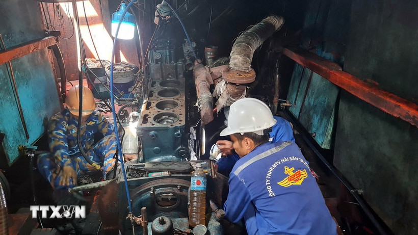 Tổ kỹ thuật của Trung tâm dịch vụ Hậu cần-Kỹ thuật đảo Trường Sa khắc phục sự cố tàu cá. (Nguồn: TTXVN phát)