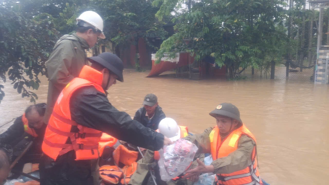 Mực nước ngập có nơi hơn 3 mét, dòng chảy xiết khiến công tác tiếp cận người dân gặp nhiều khó khăn. Lực lượng cứu trợ đã phải dùng thuyền nhỏ để trung chuyển hàng hóa, sau đó bàn giao cho tổ trưởng tổ dân phố tiếp tục đưa đến từng hộ gia đình ở khu vực trọng điểm, đảm bảo không ai bị thiếu đói, rét mướt.