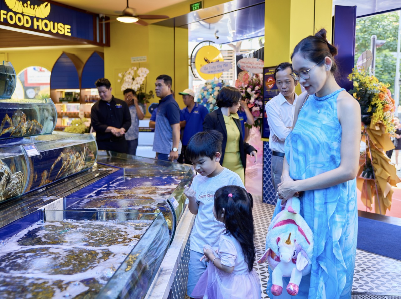 Người dân tham quan một cửa hàng bán cua hoàng đế cùng nhiều loại hải sản cao cấp khác tại TPHCM
