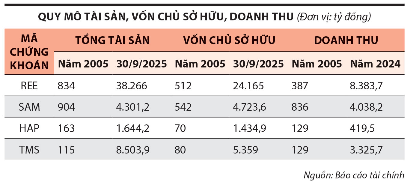 Tuy nhiên, hành trình 25 năm sau lại cho thấy sự đối lập rõ nét. Tính đến ngày 30/9/2025, tổng tài sản của REE đã vươn lên 38.266 tỷ đồng, gấp 8,9 lần SAM (4.301,2 tỷ đồng). Vốn chủ sở hữu của REE đạt 24.165 tỷ đồng, cao gấp 5,1 lần SAM (4.723,6 tỷ đồng). Năm 2024, doanh thu REE đạt 8.383,7 tỷ đồng, tương đương 2,08 lần mức 4.038,2 tỷ đồng của SAM.