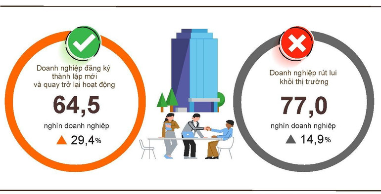 Bên cạnh đó, cả nước có 29,0 nghìn doanh nghiệp quay trở lại hoạt động (giảm 0,2% so với cùng kỳ năm 2025), nâng tổng số doanh nghiệp thành lập mới và quay trở lại hoạt động trong hai tháng năm 2026 lên gần 64,5 nghìn doanh nghiệp, tăng 29,4% so với cùng kỳ năm 2025. Bình quân một tháng có 32,2 nghìn doanh nghiệp thành lập mới và quay trở lại hoạt động.