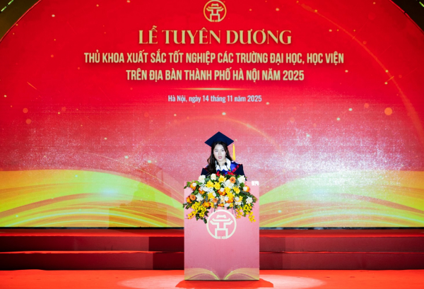 Thủ khoa Nguyễn Thị Thúy Hường (Đại học Quốc gia Hà Nội) thay mặt các Thủ khoa xuất sắc được vinh danh năm 2025 phát biểu tại buổi lễ.