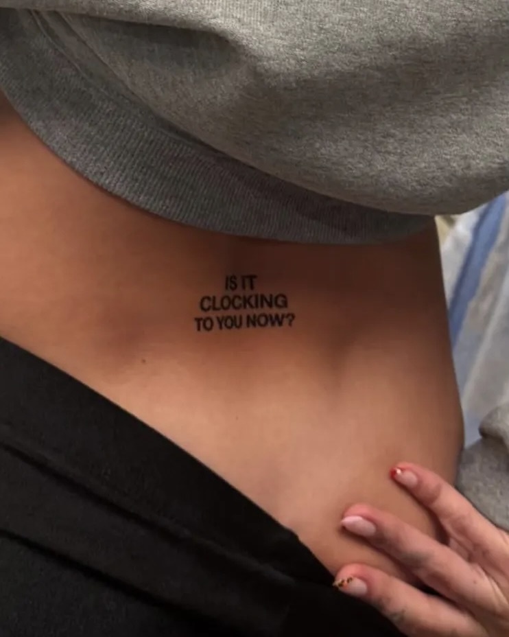 Ngoài ra, trên tin Instagram của ca sĩ Justine Skye, Hailey Bieber còn để lộ thêm một hình xăm tạm ở lưng dưới với dòng chữ “Is it clocking to you know?” (tạm dịch: “Giờ bạn đã hiểu chưa?”). Câu nói này gợi nhắc đến đoạn video lan truyền trước đó, khi Justin Bieber đối chất với paparazzi.