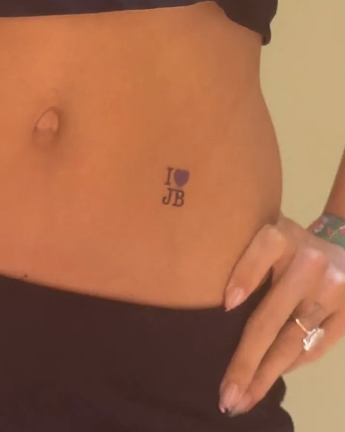 Trong bài đăng ngày 14/4, Hailey Bieber chia sẻ lại loạt hình ảnh về sự kiện âm nhạc, trong đó gây chú ý với hình xăm tạm thời “I JB” ở hông. Cô thể hiện tình yêu với ông xã qua hình xăm được thiết kế đơn giản với biểu tượng trái tim và chữ viết tắt tên chồng.