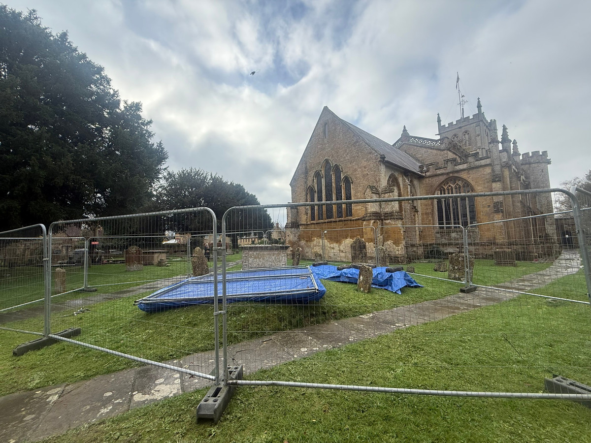 Một ngôi mộ có niên đại từ thế kỷ 18 tại nhà thờ All Saints ở Martock, Somerset, Anh, gần đây đã bất ngờ sụp đổ. Ban đầu, nhà thờ cho rằng, ngôi mộ có thể bị một hố sụt "nuốt chửng". Ảnh: Reverend Paul Fillery.