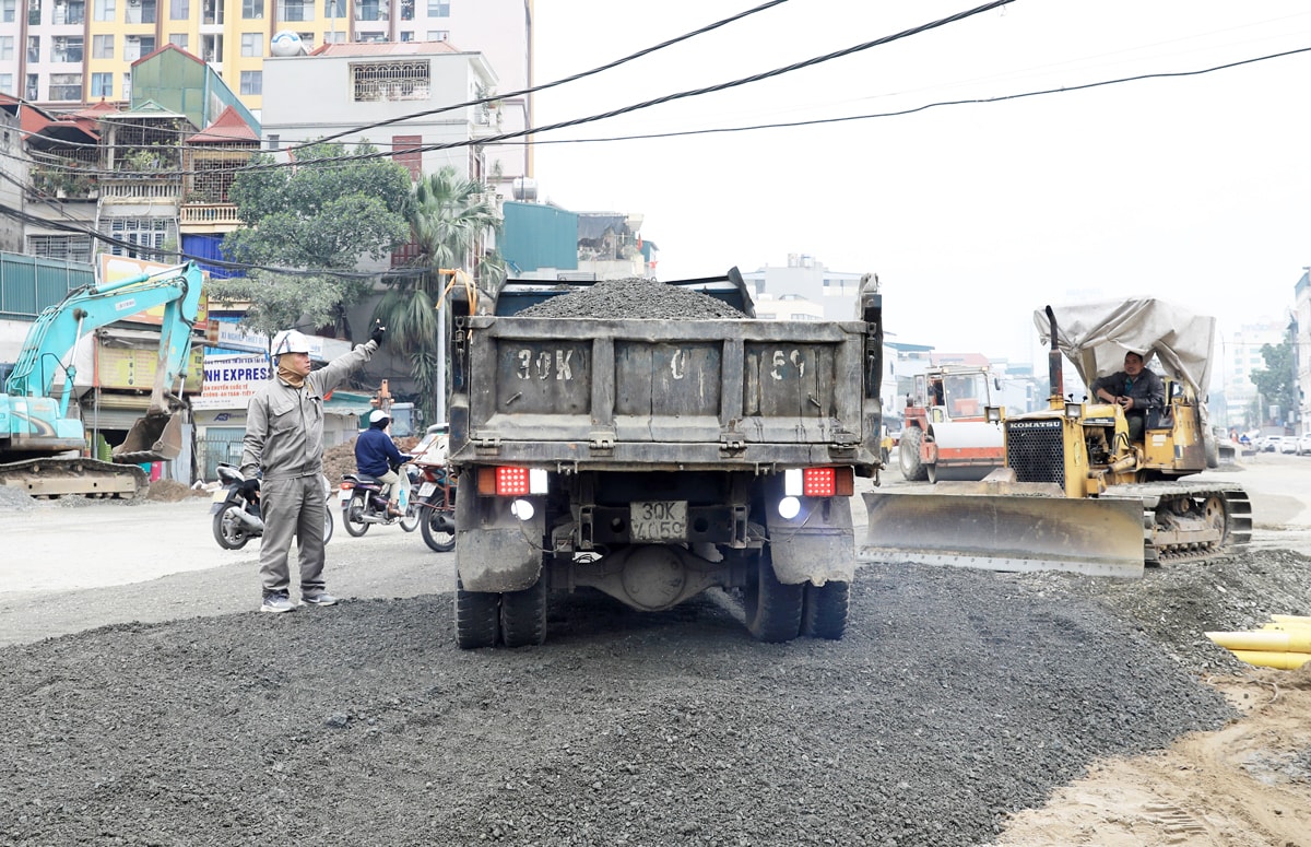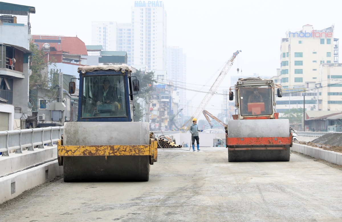 Trong những ngày này, máy móc, nhân lực nhà thầu đang tích cực triển khai các hạng mục ở khu vực đường dẫn phía bên phố Định Công.