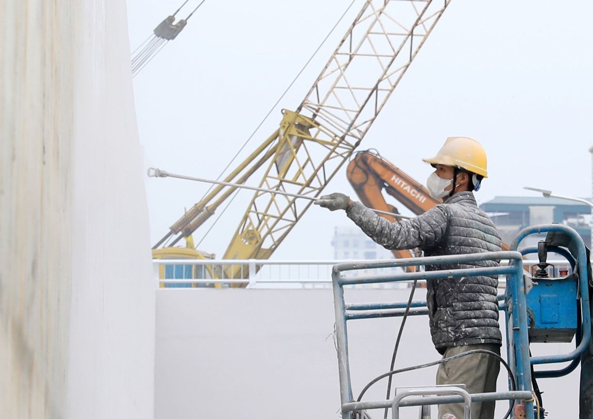 Công nhân đang sơn tường đường dẫn hầm chui.