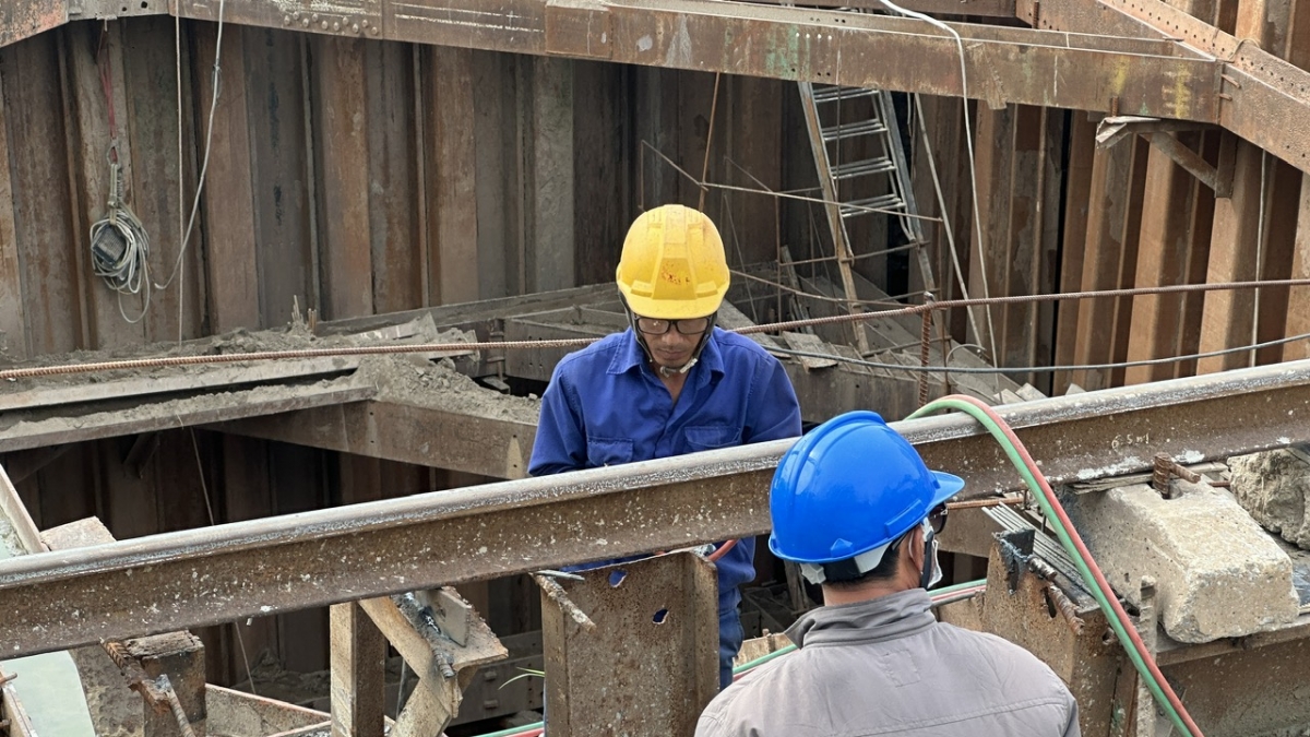 Giữa không gian chằng chịt dầm thép, khung bê tông, công nhân miệt mài thi công nhằm đáp ứng tiến độ đã đề ra