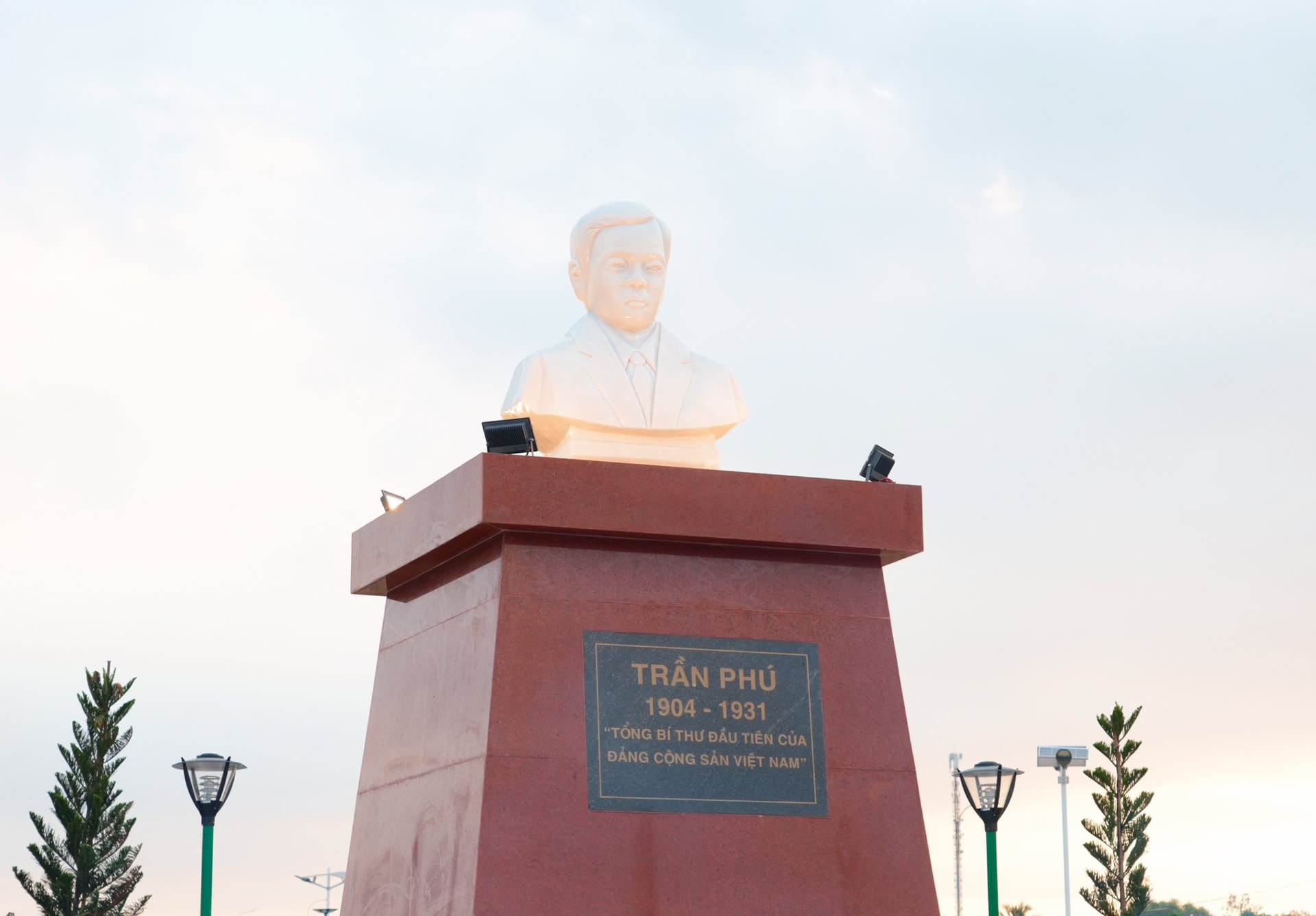 Tượng chân dung đồng chí Trần Phú được tạc bằng đá nguyên khối với kích thước 1.200 x 1.000 x 600mm được đặt trang nghiêm trong khuôn viên Công viên Trần Phú, xã Hàm Thuận Nam.