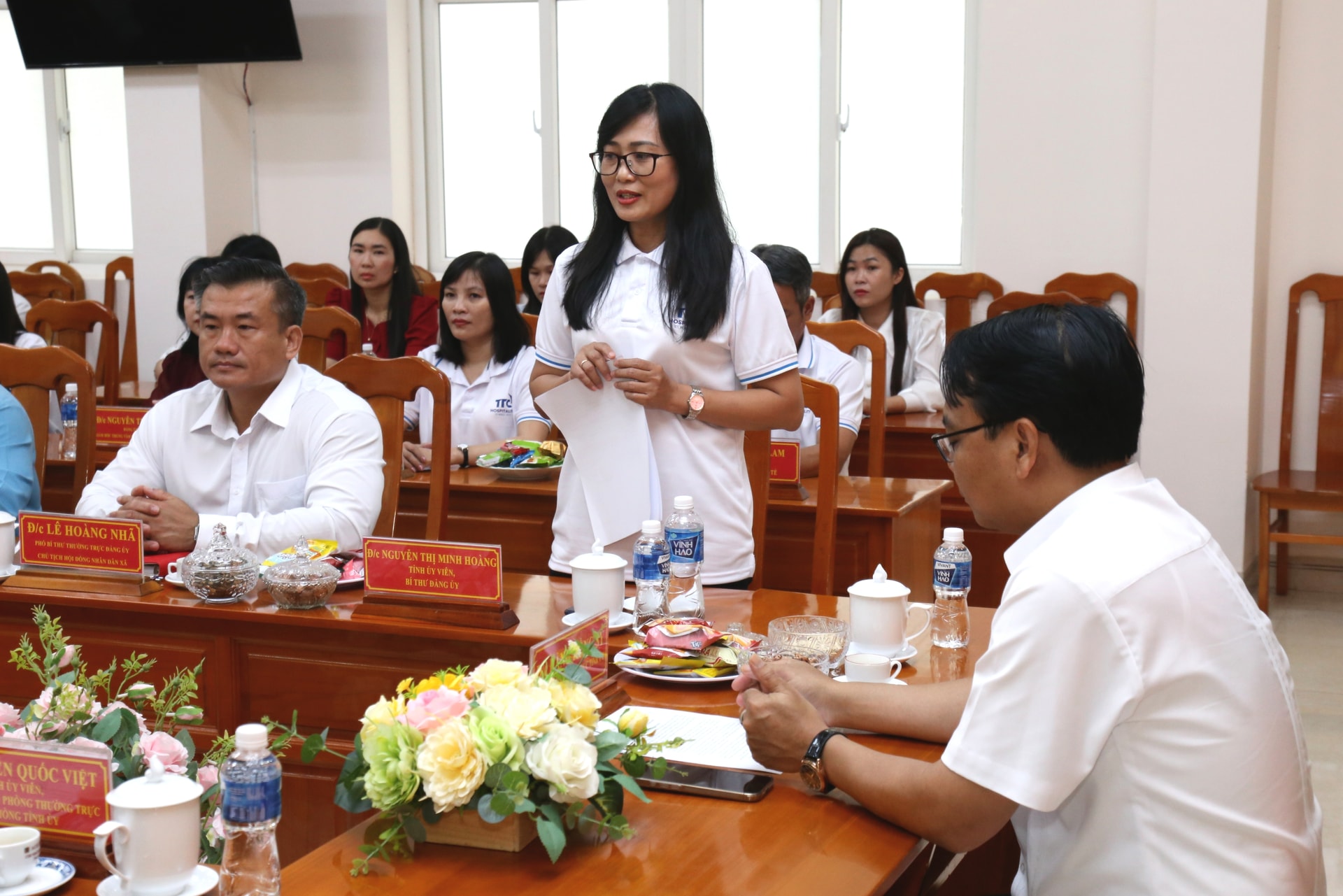Đồng chí Nguyễn Thị Minh Hoàng, Bí thư Đảng ủy xã Hàm Thuận Nam báo cáo tại buổi thăm, chúc mừng đầu Xuân