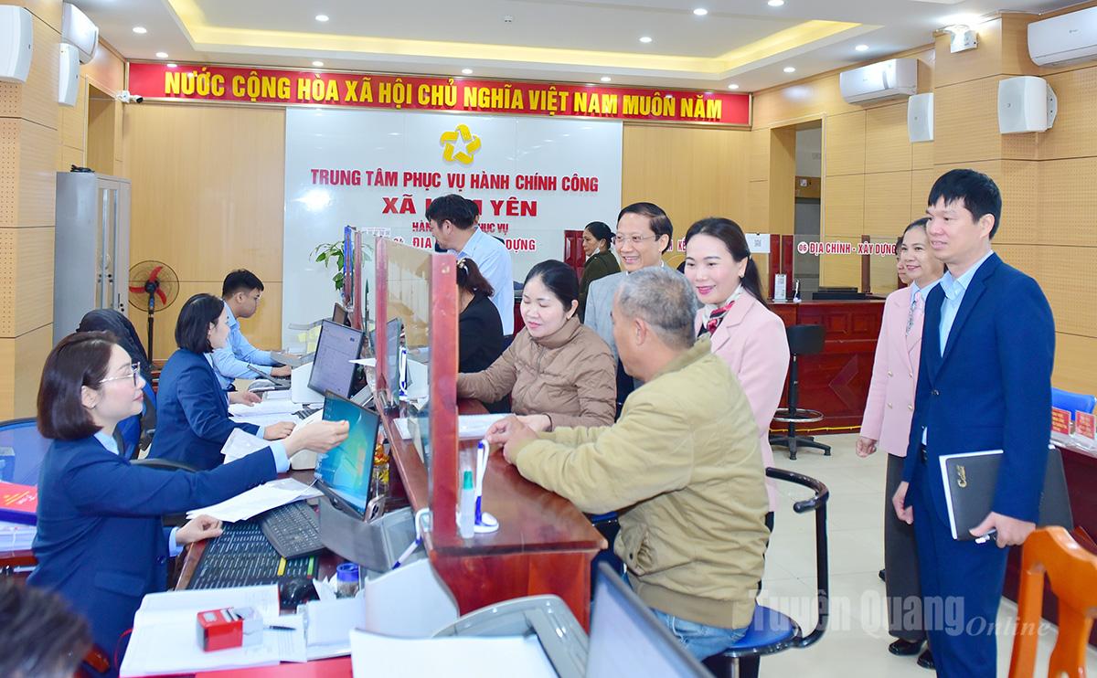 Đồng chí Phó Bí thư Thường trực Đảng ủy UBND tỉnh Nông Thị Bích Huệ kiểm tra hoạt động của Trung tâm phục vụ hành chính công xã Hàm Yên.