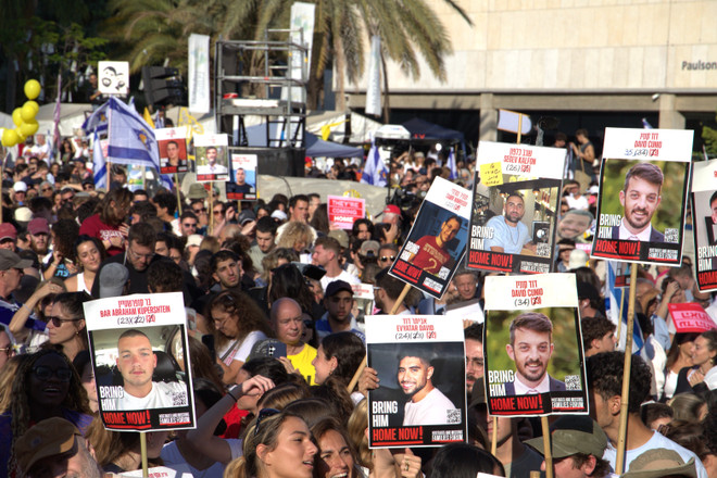 Hàng nghìn người tập trung tại Quảng trường Con tin ở Tel Aviv để chờ đón thời điểm các con tin được trả tự do. (Ảnh: Thanh Bình/TTXVN)