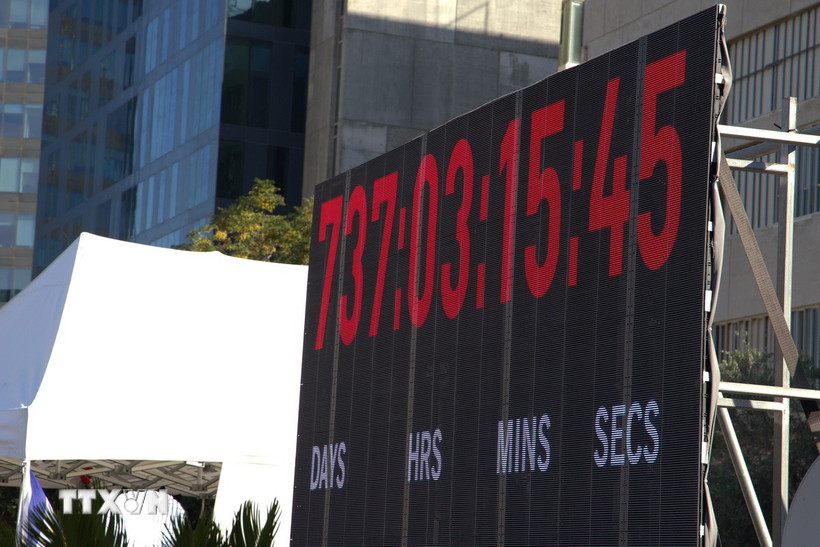 Màn hình đếm thời gian đặt ở Quảng trường Con Tin tại Tel Aviv, để đánh dấu khoảng thời gian các con tin bị giữ tại Gaza. (Ảnh: Thanh Bình/TTXVN)
