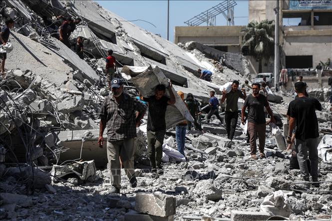 Tòa nhà bị phá hủy sau cuộc không kích của Israel xuống phía Tây thành phố Gaza, ngày 10/9/2025. Ảnh: THX/TTXVN
