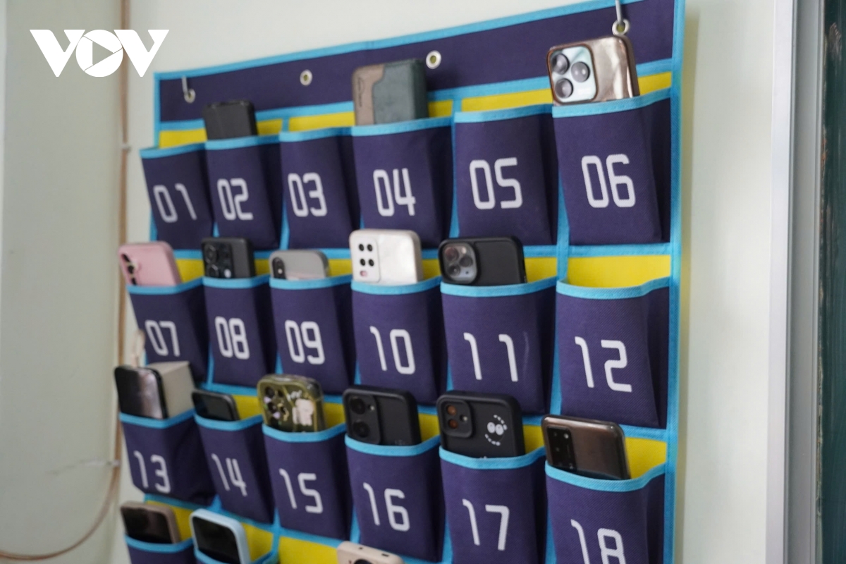 Bên cạnh đó, mỗi lớp học đều được trang bị túi đựng điện thoại đặt ngay trong lớp để học viên tự giác nộp máy vào đầu giờ theo số thứ tự. Cách làm này vừa nâng cao ý thức trách nhiệm của học viên, vừa giúp các em tự quản lý tài sản cá nhân, đồng thời vẫn đảm bảo sự linh hoạt khi cần sử dụng điện thoại phục vụ học tập.