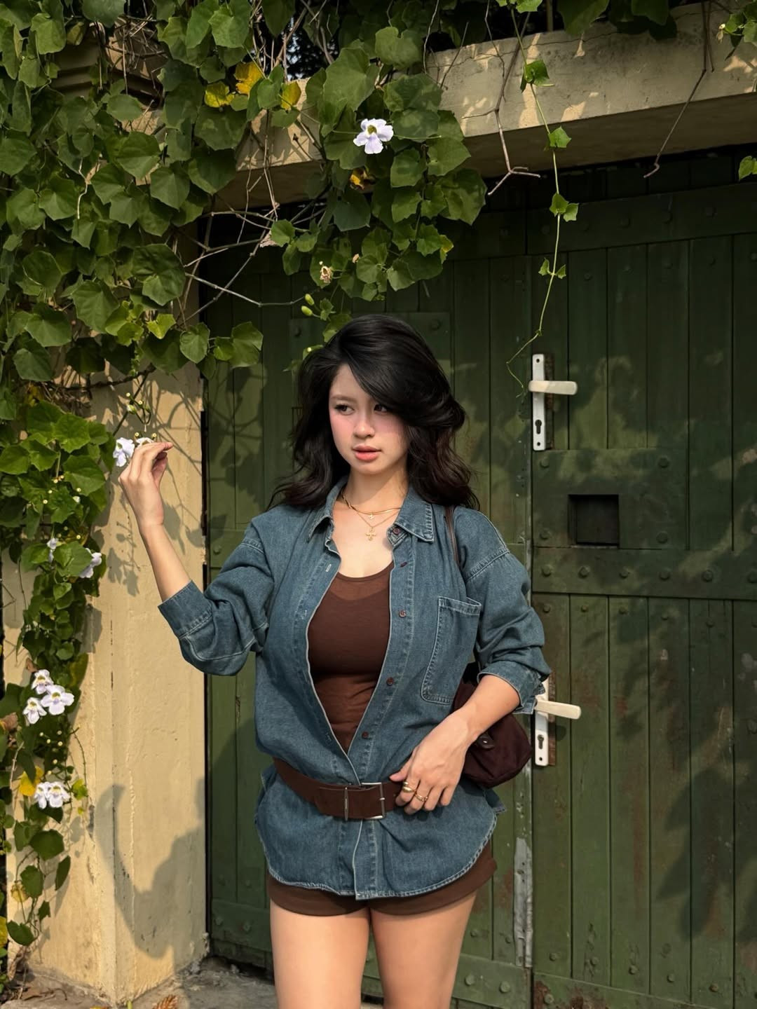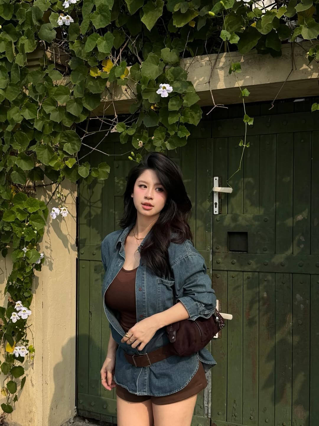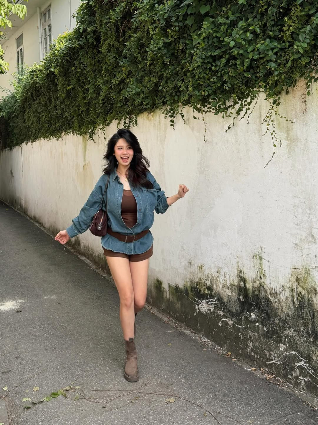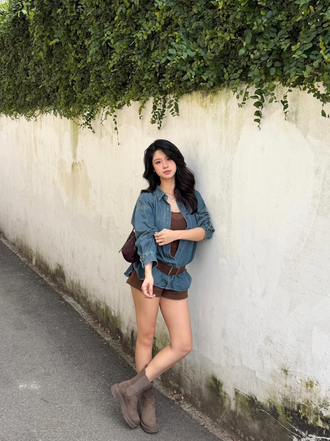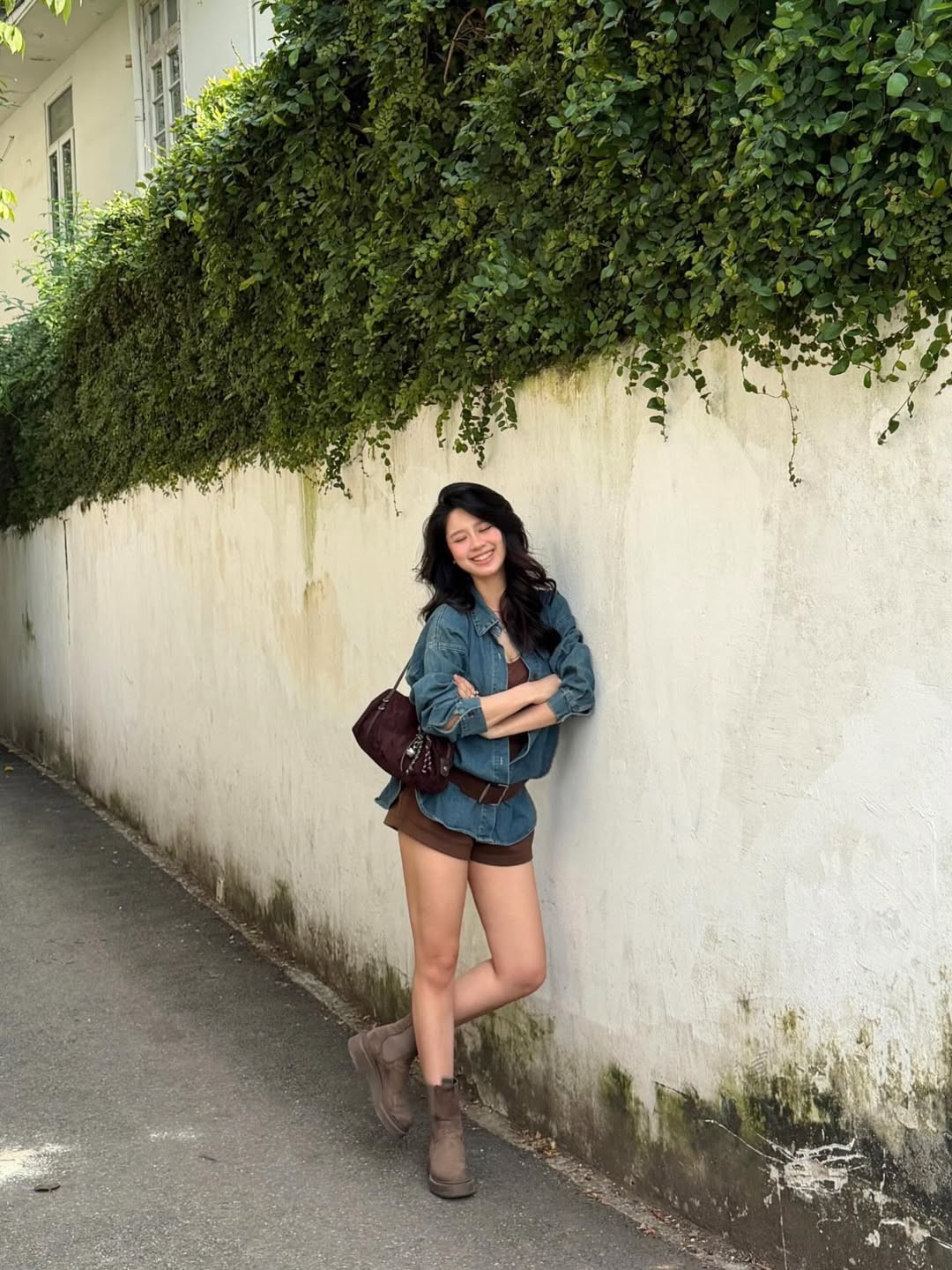 Cô diện bộ trang phục gồm áo màu nâu kết hợp cùng sơ mi denim khoác ngoài, kèm theo quần shorts ngắn đồng màu và boots da lộn cá tính. (Ảnh: IGNV)