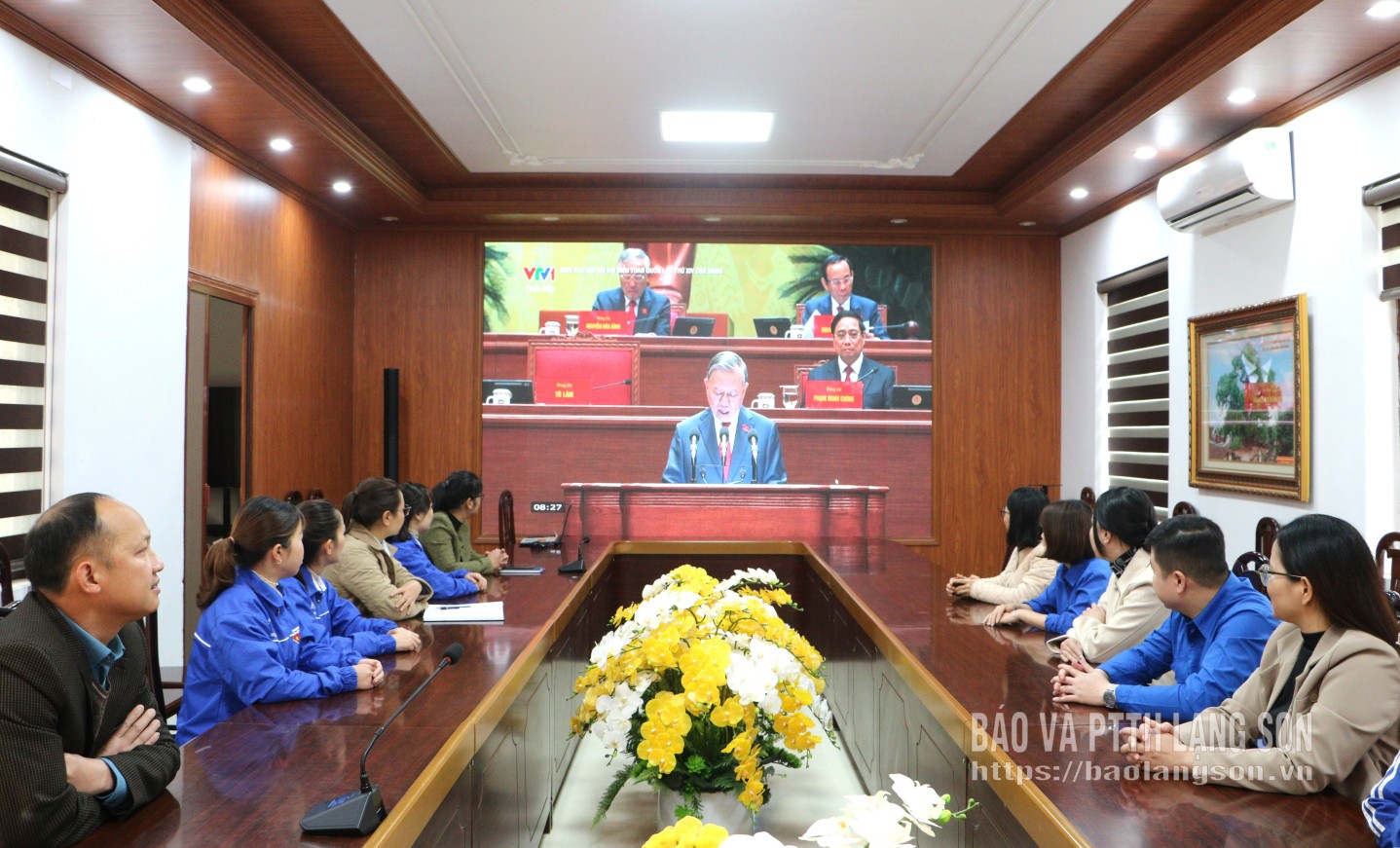 Đông đảo cán bộ, đoàn viên thanh niên xã Bằng Mạc theo dõi truyền hình trực tiếp phiên khai mạc Đại hội đại biểu toàn quốc lần thứ XIV của Đảng