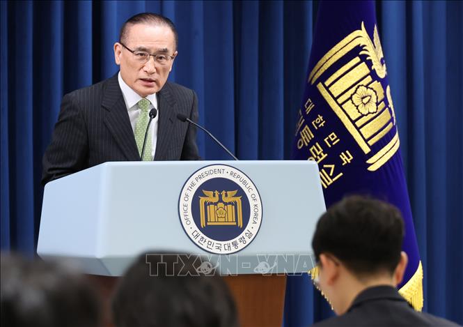 Cố vấn An ninh Quốc gia Hàn Quốc Wi Sung Lac phát biểu tại một cuộc họp báo ở thủ đô Seoul. Ảnh: Yonhap/TTXVN
