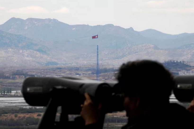 Hình ảnh được chụp từ đài quan sát Dora gần khu phi quân sự ngăn cách hai miền Triều Tiên, cho thấy lá cờ Triều Tiên tung bay trên đỉnh một tòa tháp cao 160 mét tại làng tuyên truyền Gijungdong của Triều Tiên. (Ảnh: Reuters)