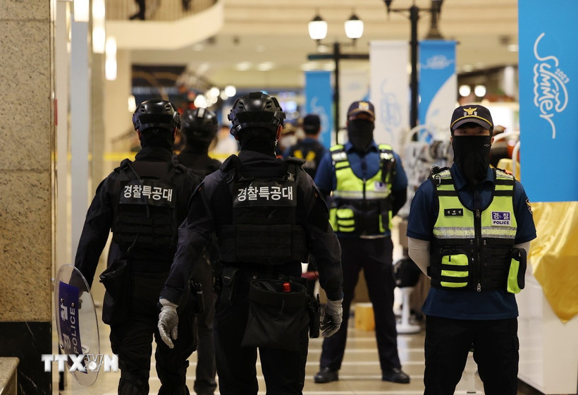 Cảnh sát tuần tra tại ga tàu điện ngầm Seohyeon, phía Nam thủ đô Seoul, Hàn Quốc. Ảnh minh họa: Yonhap/TTXVN