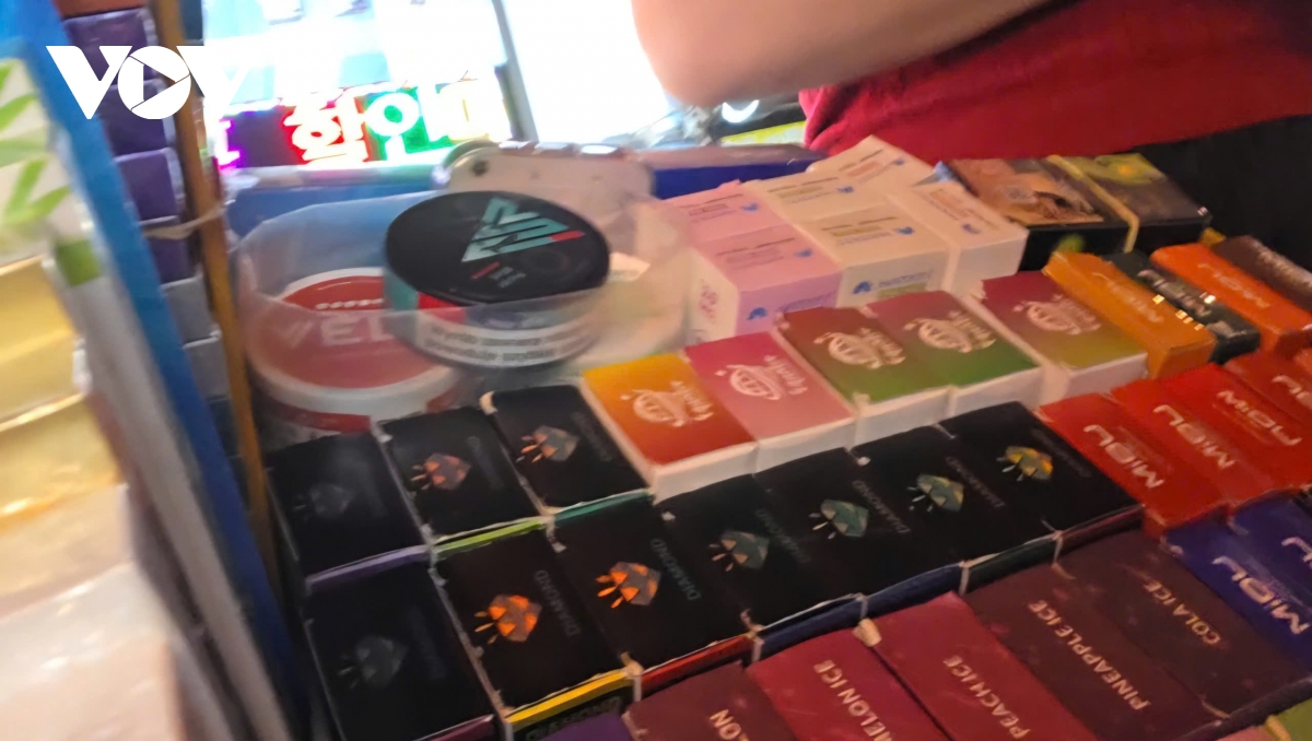 Vừa đặt chân vào khu chợ, phóng viên lập tức bị một phụ nữ trung niên từ quầy hàng thuốc lá mời chào. Quan sát nhanh cho thấy phần lớn các loại thuốc lá bà này rao bán đều là hàng ngoại như Hero, Jest, 555… Tuy nhiên, thứ được bày nhiều nhất lại là tinh dầu thuốc lá điện tử: khoảng 20 hộp, mỗi hộp được chào giá 300.000 đồng. Người bán quả quyết đây là “hàng tốt”, nhập trực tiếp từ Hàn Quốc nên “cứ yên tâm mà dùng”. Vừa nói, bà vừa chỉ vào những hộp tinh dầu xanh đỏ trước mặt: “Ai dùng vape thì chỉ cần cho vào là hút được ngay. Loại này 200 ml, đủ các mùi nho, táo, bạc hà…”