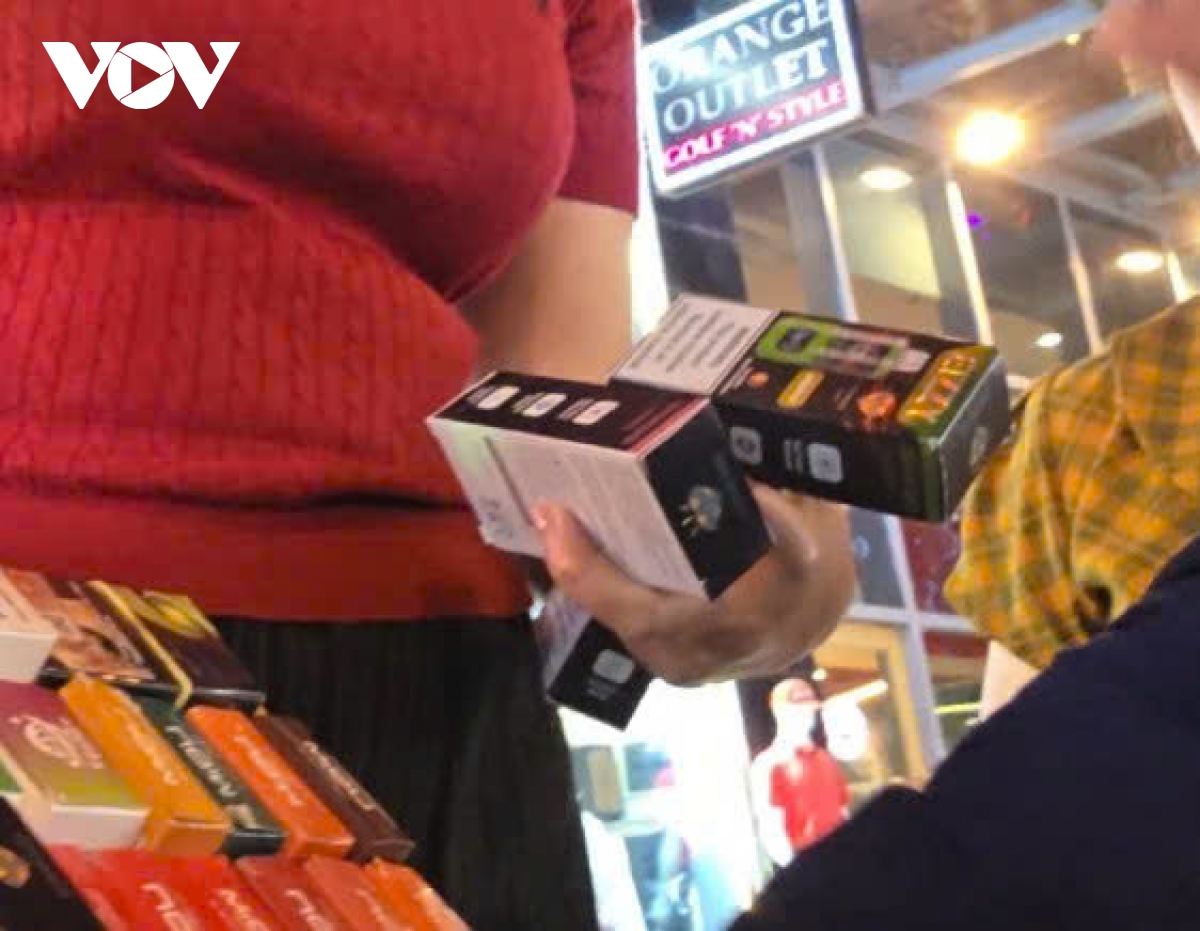 Với lý do vape (máy thuốc lá điện tử) của phóng viên đã bị hỏng, người phụ nữ bán hàng lập tức chỉ tay xuống những chiếc hộp thuốc lá điện tử bày sẵn và nói: “Loại này 45 nghìn hơi, hút có vỡ phổi cũng không hỏng. Thích mùi cà phê, hương vani hay loại gì đều có hết”.