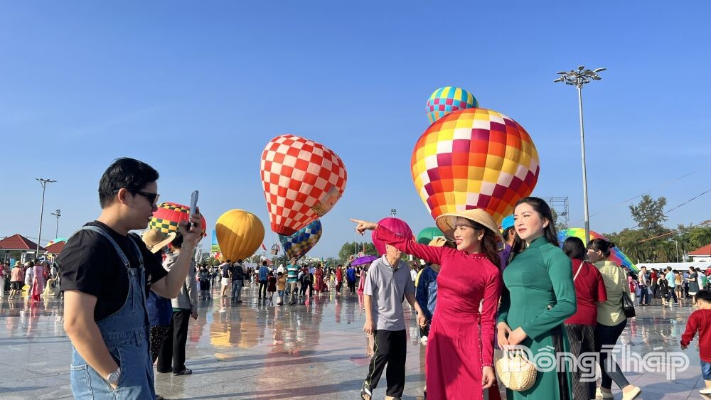 Du khách thích thú chụp ảnh lưu niệm bên những chiếc khinh khí cầu lung linh sắc màu tại Quảng trường Sa Đéc.