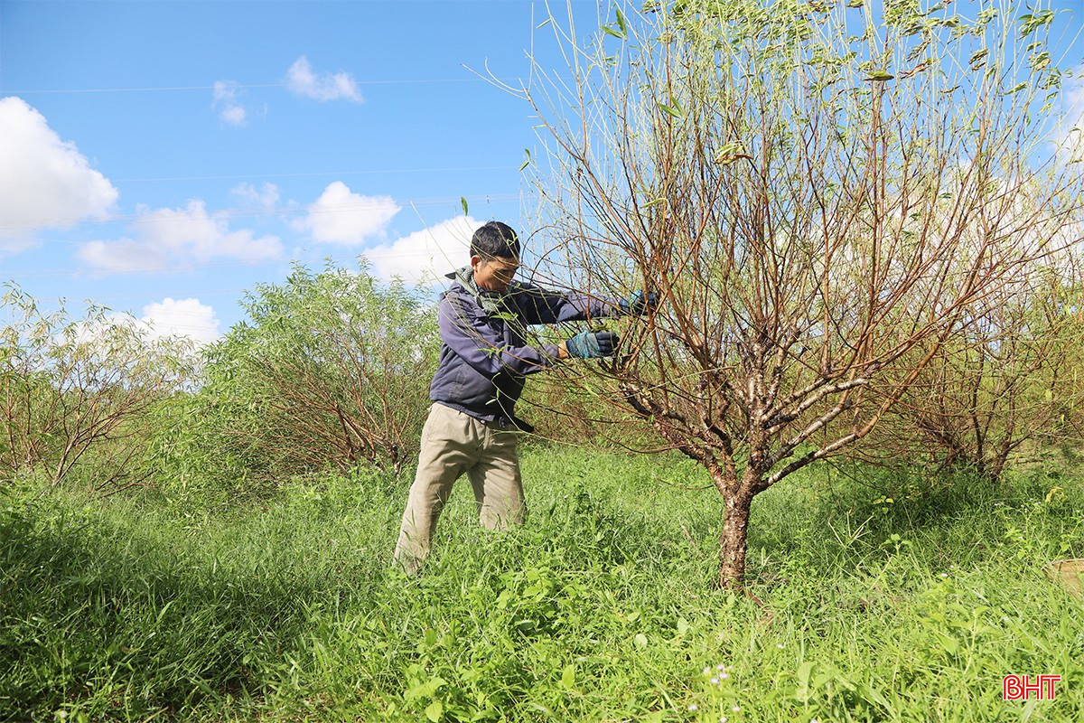 Gia đình anh Hồ Sỹ Sự là một trong những hộ trồng đào lớn của thôn với hơn 1.500 gốc. Năm nay, nhờ chăm sóc kỹ lưỡng, vườn đào phát triển tốt, cây khỏe, gốc đẹp.